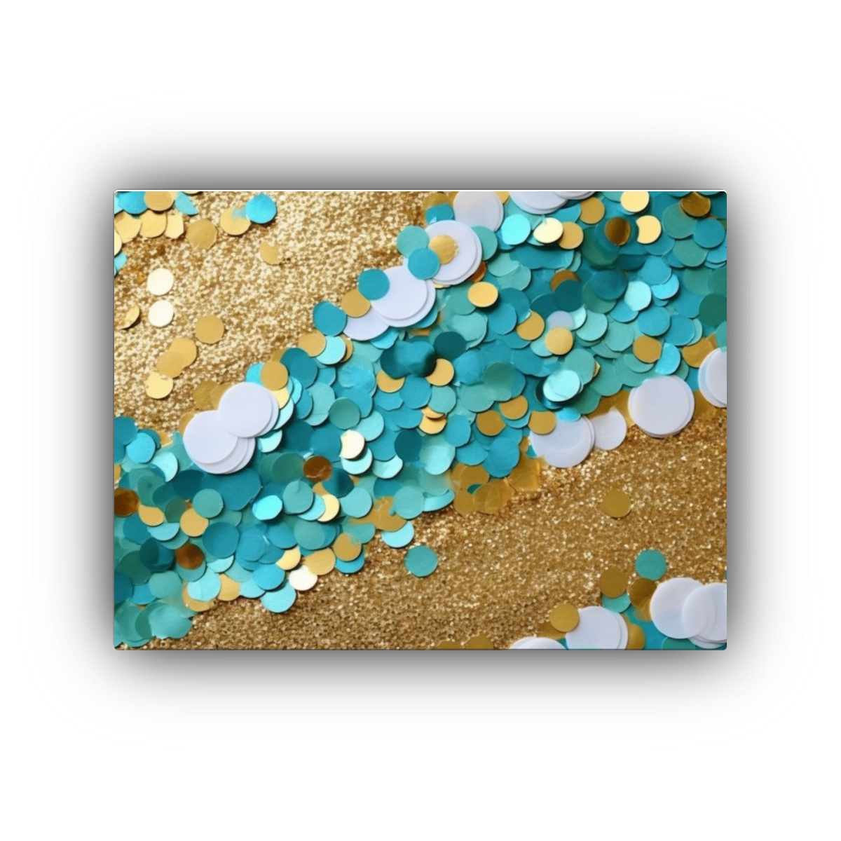 Coloca el cuadro Fondo de verano en turquesa, oro y plata sobre una pared blanca para lograr un contraste llamativo y moderno Complementa con cojines en tonos coral, amarillo claro y menta para una decoración vibrante y llena de vida