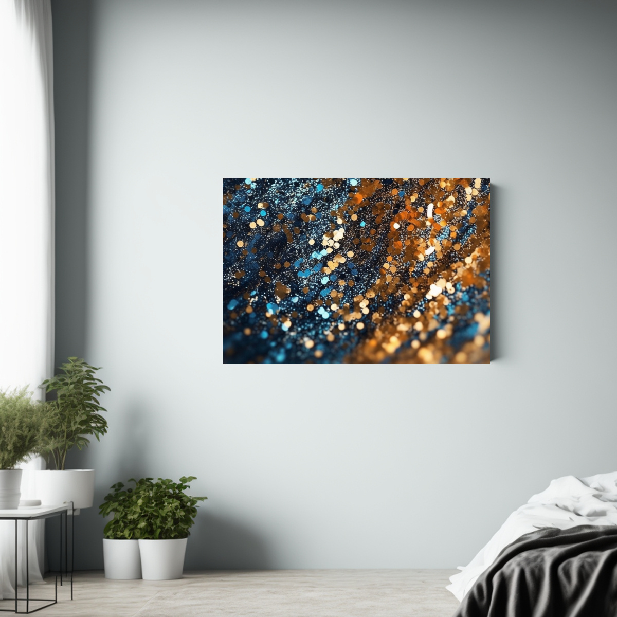Este cuadro abstracto de luces azules, doradas y negras sería ideal para colocar en el salón principal de tu hogar, creando un ambiente sofisticado y moderno Combínalo con muebles en tonos neutros para resaltar su belleza