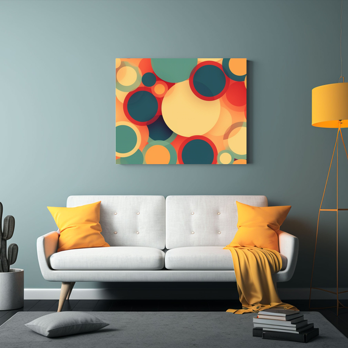 Coloca este llamativo lienzo retro con círculos coloridos en la sala de estar para crear un punto focal vibrante Combínalo con muebles en tonos neutros para que resalte y añada un toque moderno a la decoración de tu hogar