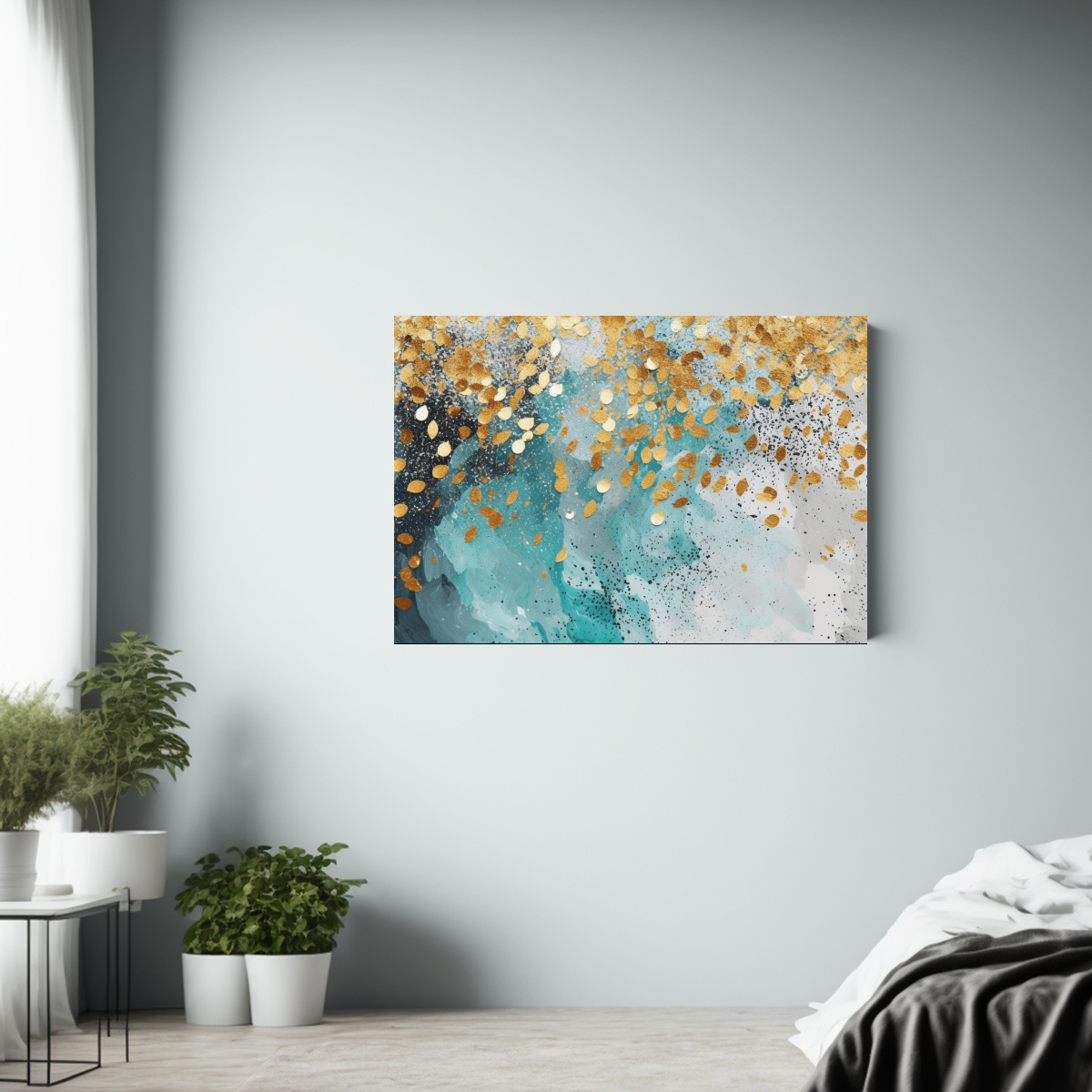 Para resaltar la belleza del cuadro ‘Fondo Verano Turquesa Oro Plata’, te recomiendo colocarlo en la pared principal de tu sala de estar o en un espacio donde pueda ser el centro de atención Combínalo con muebles en tonos neutros para crear un ambiente sofisticado y moderno ¡Dale un toque de elegancia a tu hogar con este cuadro exclusivo de DecoCuadros!
