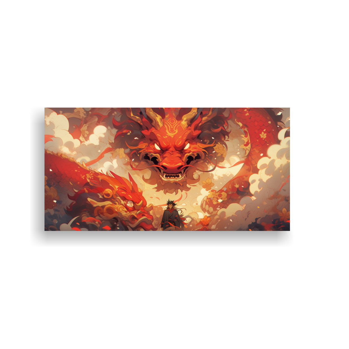 Este cuadro de un dragón en rojo y oro con atmósfera neonoir sería ideal para decorar una sala de estar o un estudio, creando un ambiente misterioso y elegante Combínalo con muebles en tonos oscuros para resaltar su presencia y agregar un toque de sofisticación a tu espacio
