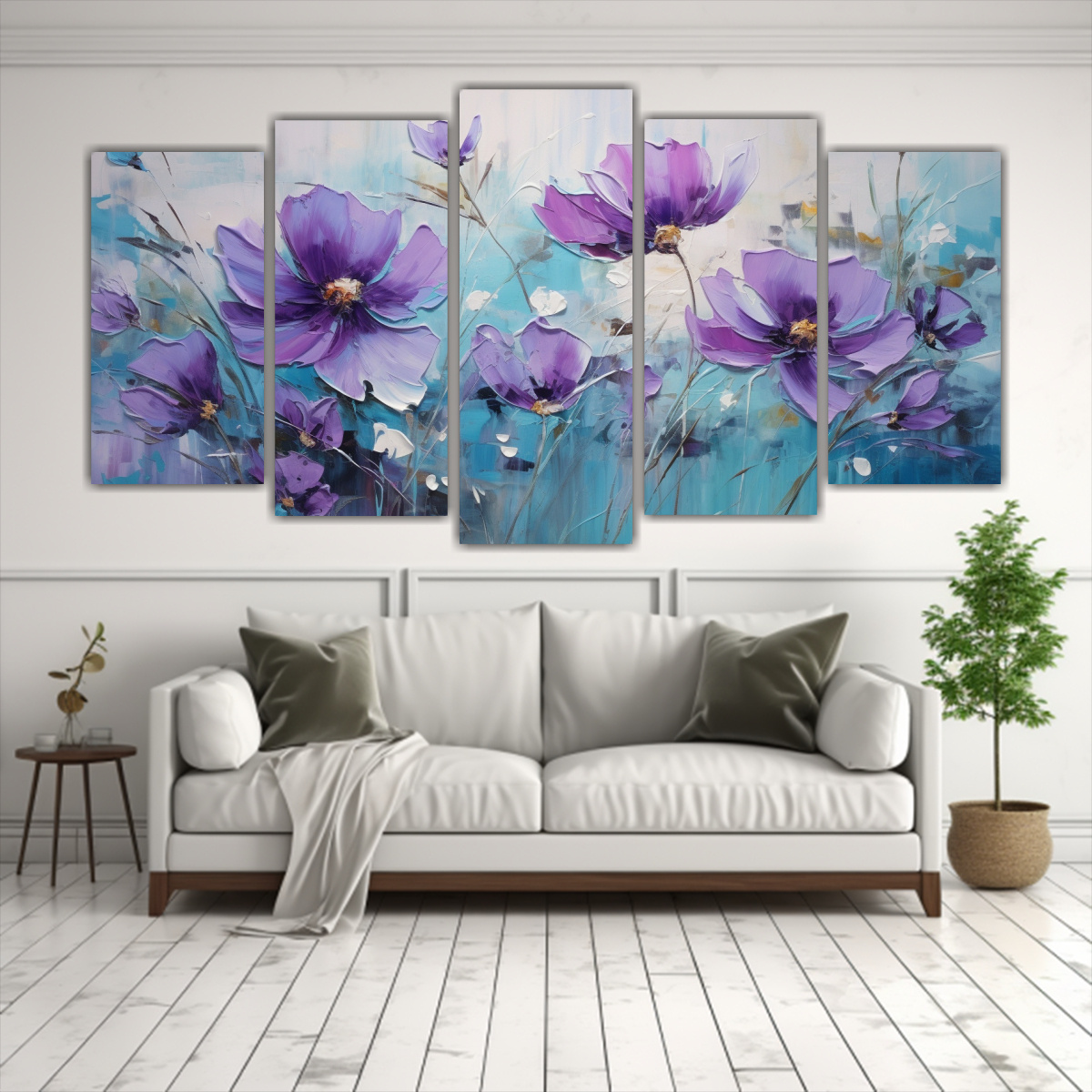 Añade un toque de elegancia y color a tus paredes con este set de 5 cuadros fotográficos en lienzo de alta calidad Las imágenes de naturaleza viva en tonos púrpura y turquesa brindarán armonía y frescura a cualquier espacio