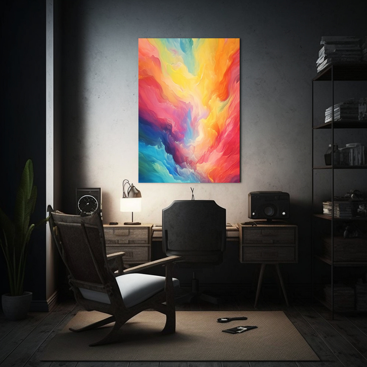 Genera una obra abstracta que capture la esencia de la decoración de acuarela con colores verde azulado, coral, carmesí, plateado, amarillo claro, gris, turquesa y azul marino grisáceo Cuadro impreso en tela de alta calidad con bastidor de madera