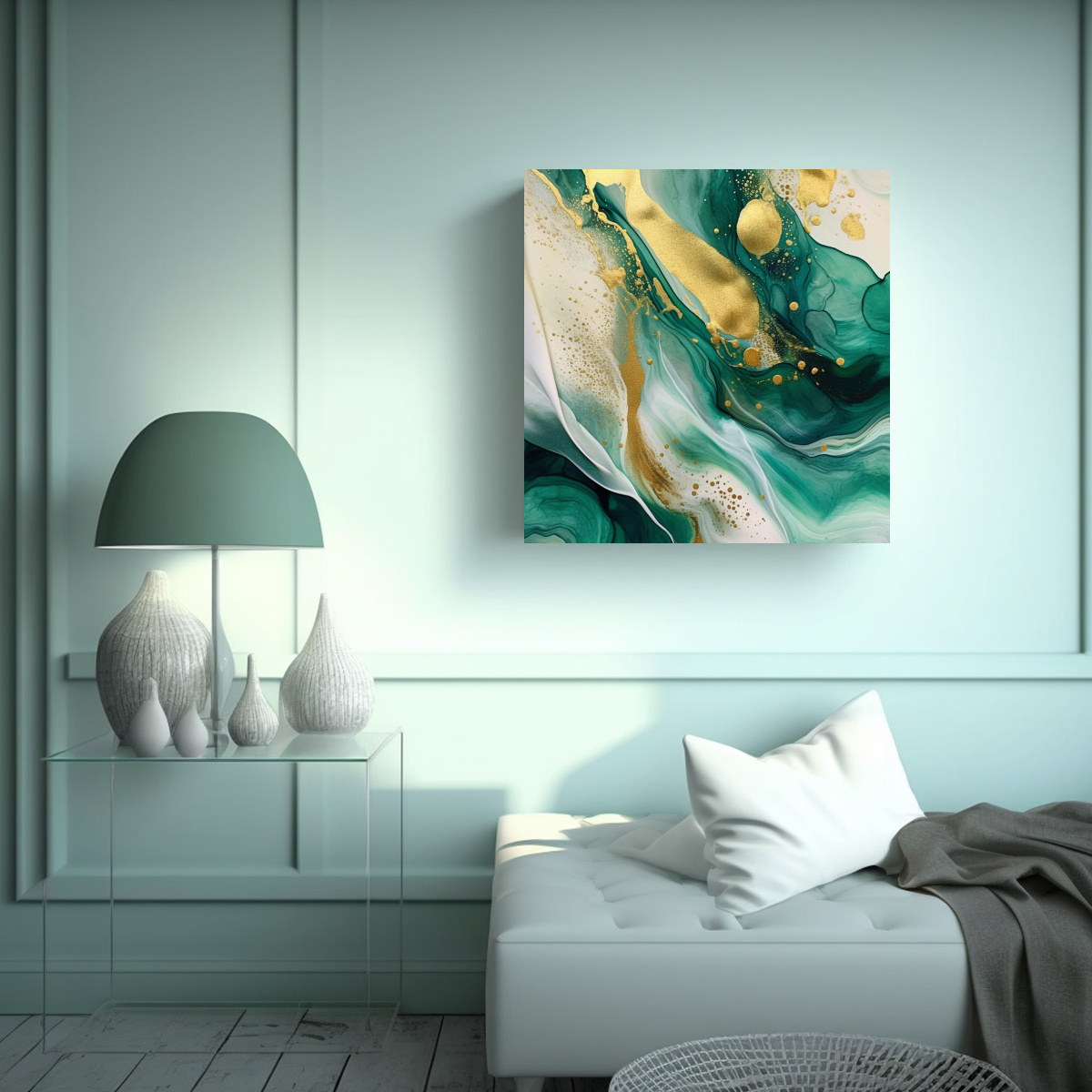 El cuadro minimalista conceptual en tonos esmeralda y dorado en estilo resina luminosa de DecoCuadros es perfecto para aquellos que buscan una pieza única y exclusiva para decorar sus espacios Con colores como plateado, verde azulado, negro, gris, chocolate, menta, turquesa y coral, este cuadro brinda una combinación armoniosa y elegante