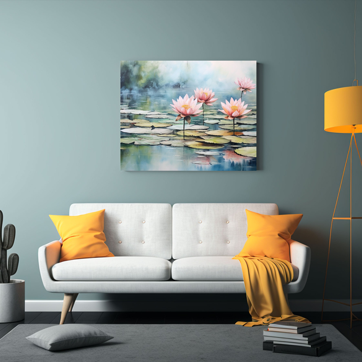Este cuadro de loto rosa, verde y azul quedará perfecto en tu sala de estar sobre un sofá de color neutro, creando un contraste elegante Combínalo con cojines en tonos plateado, lila y menta para lograr una armonía en la decoración