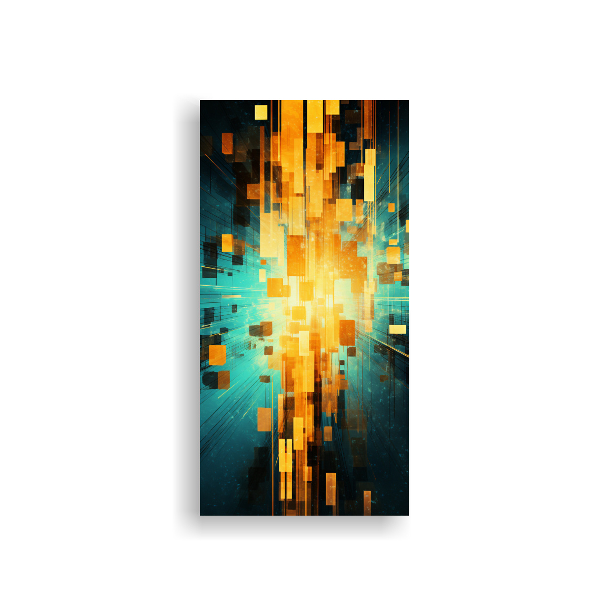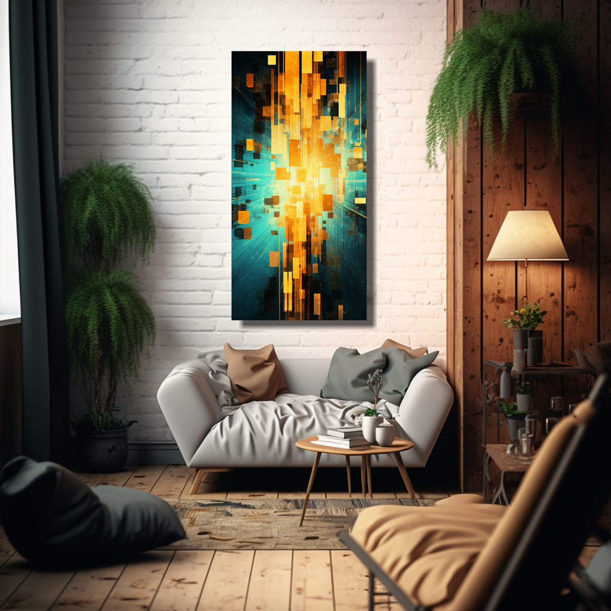 Este cuadro innovador en tonos mostaza, turquesa, negro, chocolate, plateado, verde azulado, azul marino grisáceo y menta sería perfecto para decorar una sala de estar moderna Colócalo sobre un sofá de color neutro para crear un contraste llamativo Combínalo con cojines y cortinas en tonos similares para lograr una armonía visual ¡Agrega un toque de estilo futurista a tu hogar con este cuadro exclusivo de DecoCuadros!