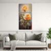 Este cuadro se verá espectacular en tu sala de estar Colócalo sobre un sofá gris para resaltar los tonos naranjas de las rosas y combínalo con cojines en color coral y plateado Completa la decoración con cortinas en tonos dorados y una alfombra en color mostaza ¡Crea un ambiente cálido y elegante con este hermoso juego de telas!