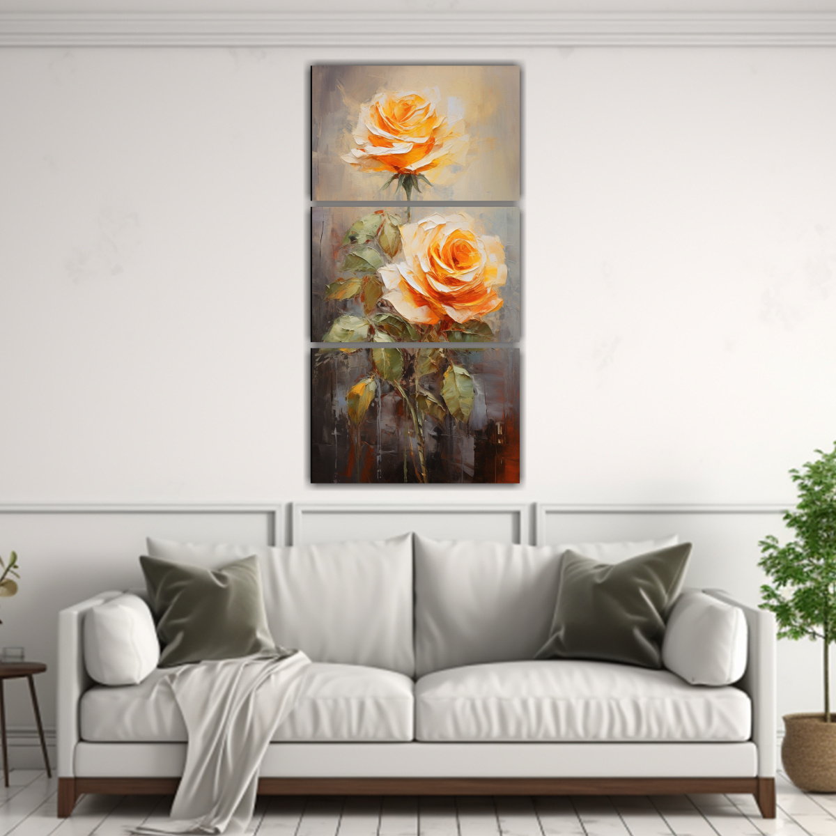 Decora tu hogar con el Set 3 Lienzos De Tela Espectacular Living a orange Roses painting, una combinación de colores Gris, Azul Marino grisaceo, Dorado, Chocolate, Mostaza, Plateado y Coral Disfruta de la mejor calidad y los precios más económicos en DecoCuadros