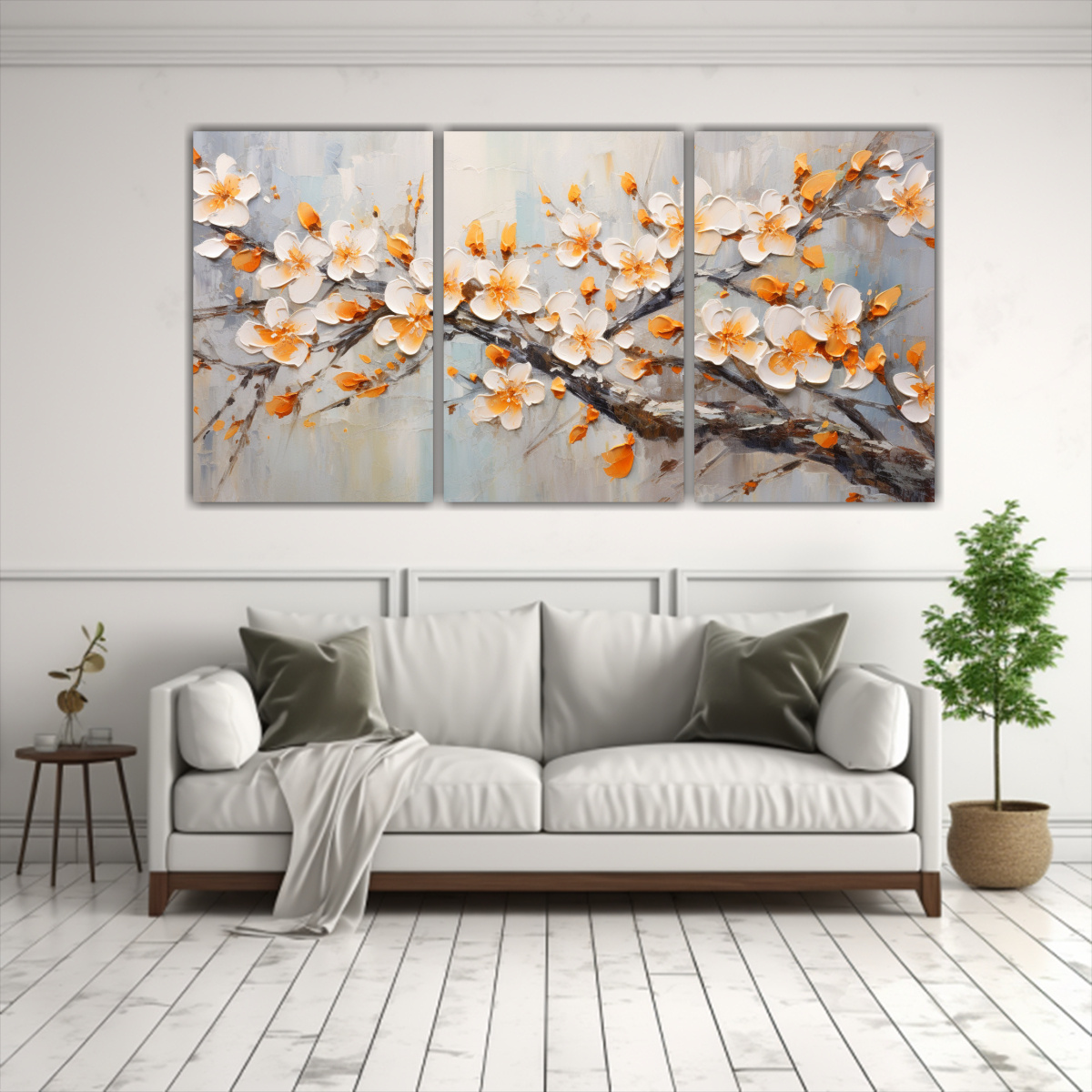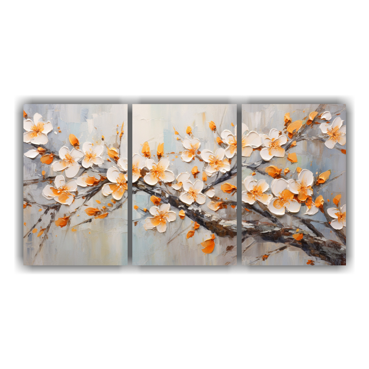 Juego De 3 Lienzos De Tela Patrón Intenso Clásico De Flores De Cerezo Naranja En Pintura Decorativa