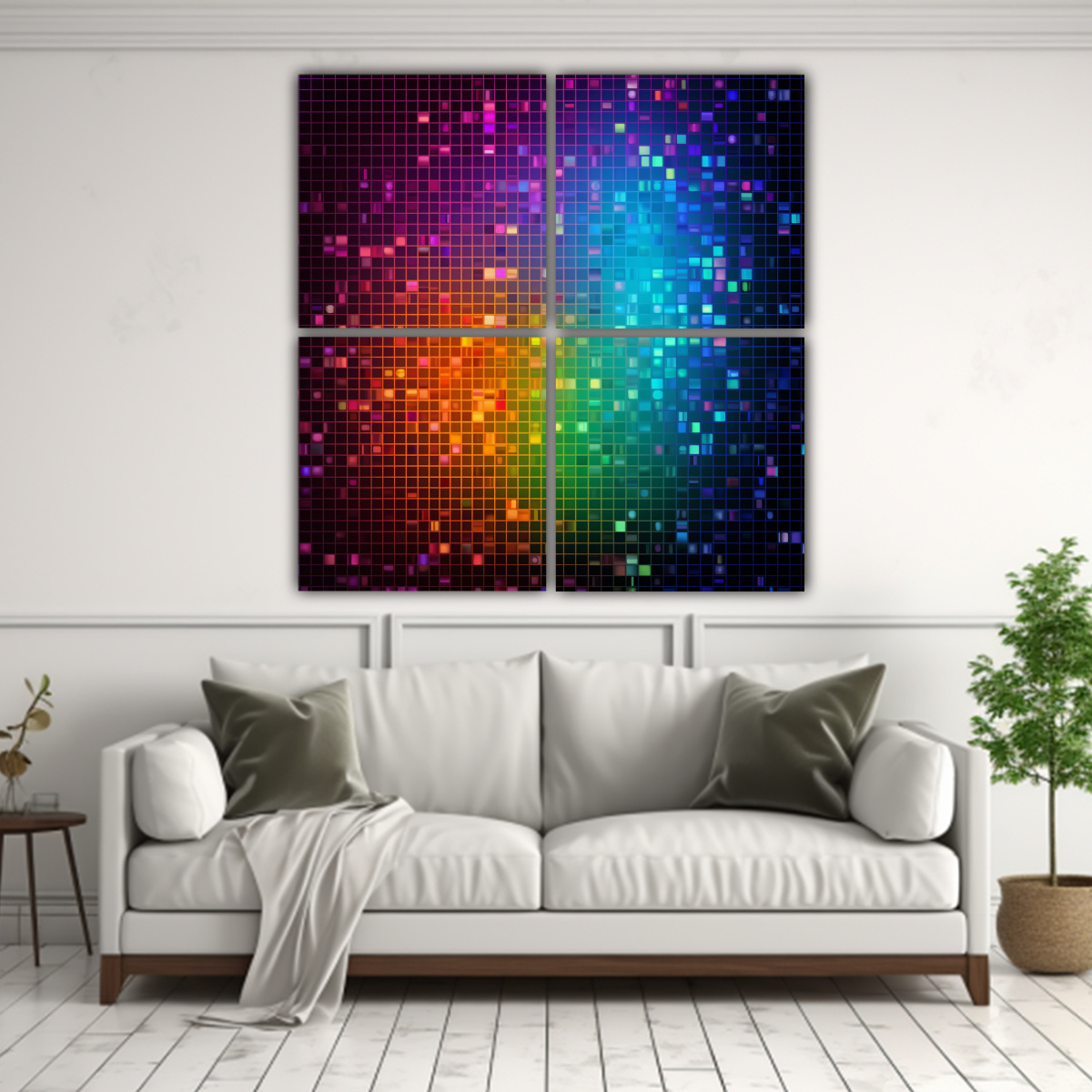 Este lienzo abstracto de composición dinámica de cuadrados arcoíris se verá espectacular en tu sala de estar Colócalo sobre un sofá gris o menta para resaltar los tonos de la imagen También puedes combinarlo con cojines o cortinas en tonos carmesí o dorado para crear una estética armoniosa ¡Atrévete a darle un toque moderno y vibrante a tu hogar con este cuadro de DecoCuadros!