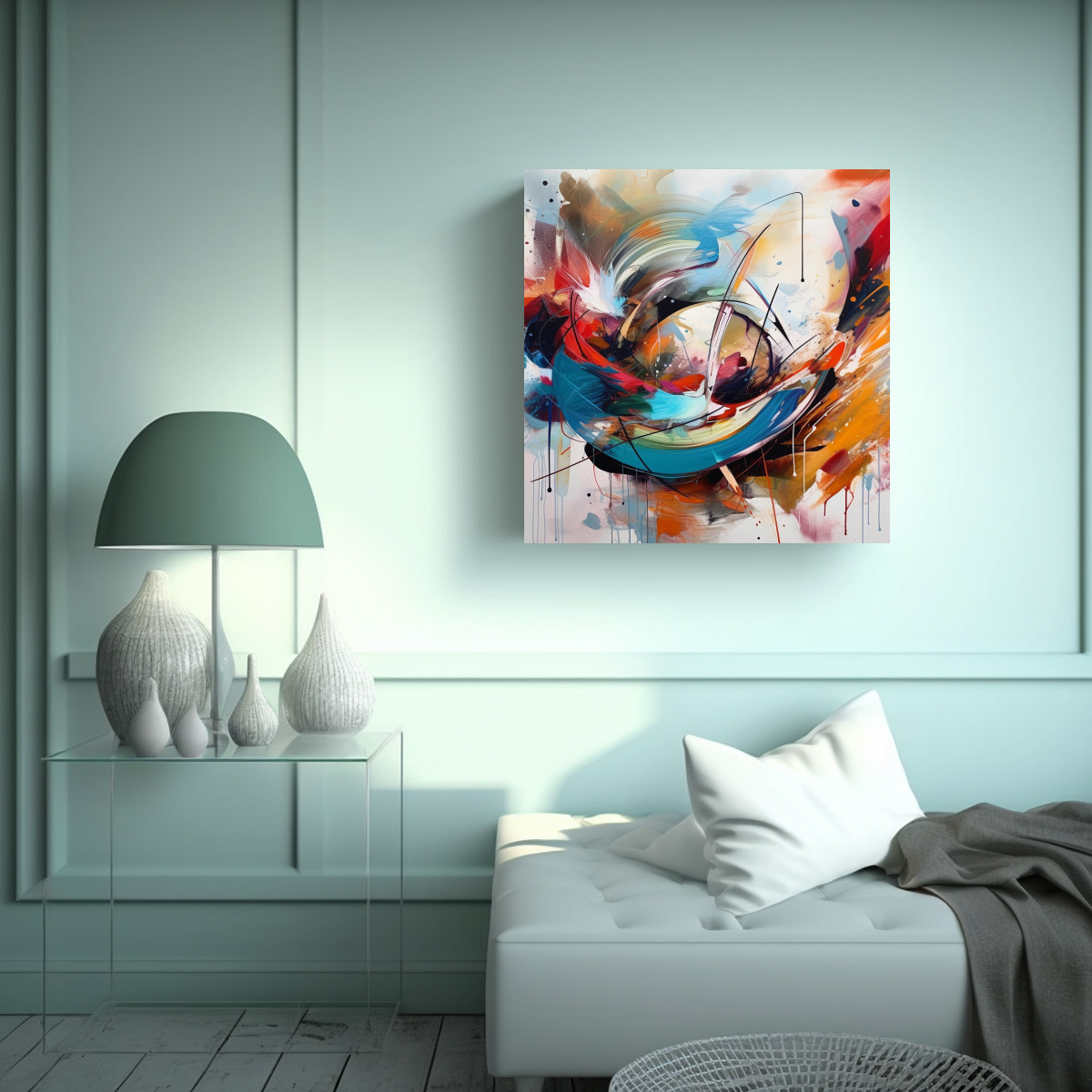 Coloca este lienzo de tela acuarela espacial con un giro interesante en tu sala de estar para crear un ambiente moderno y elegante Combínalo con muebles en tonos neutros y accesorios en colores plateados y turquesa para resaltar los colores del cuadro También puedes colocarlo en tu dormitorio para añadir un toque de estilo y tranquilidad ¡Decora con estilo y calidad con DecoCuadros!