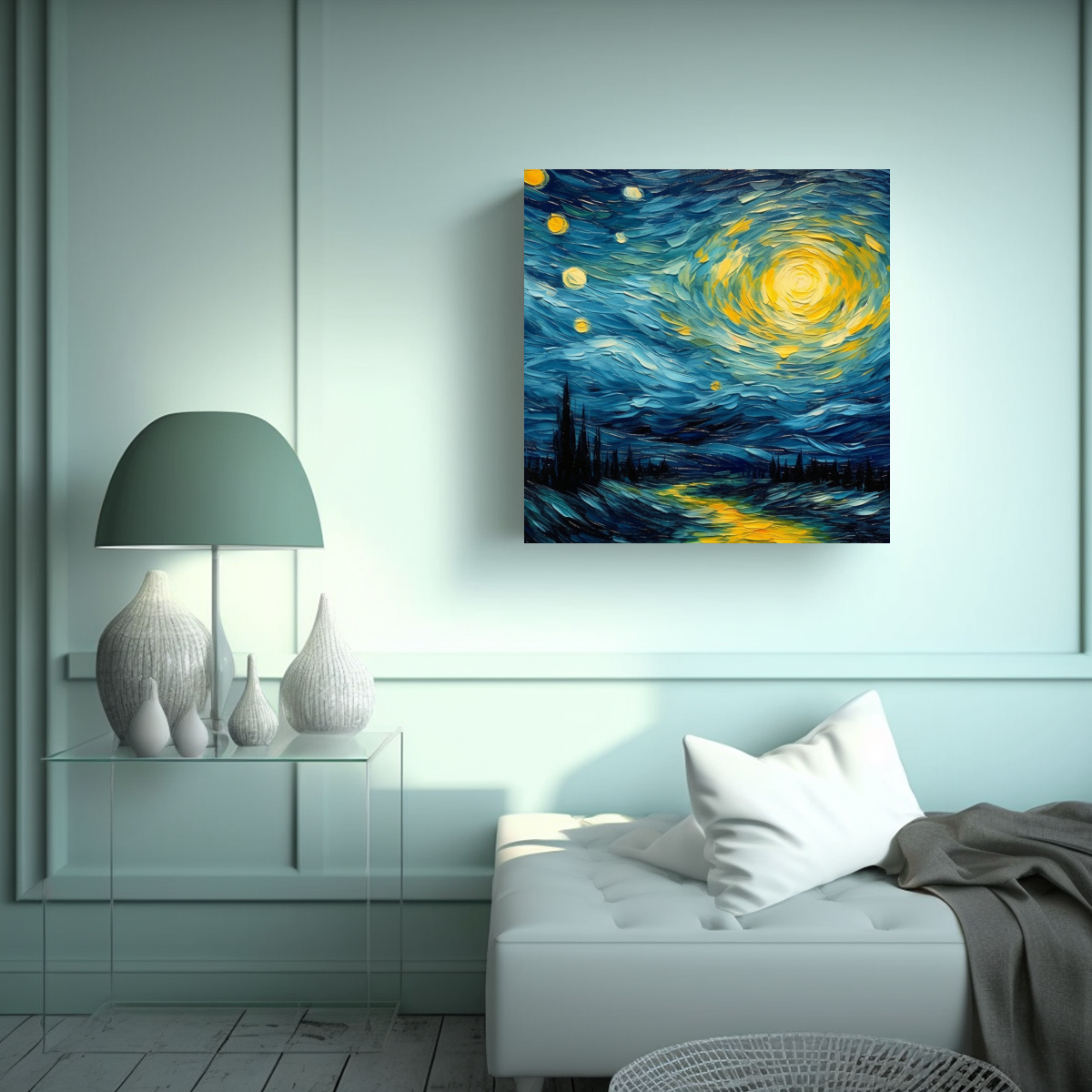 Este lienzo de tela colores estilo cielo del norte al estilo de Van Gogh es perfecto para decorar tu sala de estar o dormitorio Combínalo con muebles de tonos neutros como beige o blanco para resaltar sus colores vibrantes También puedes colocarlo en una pared de acento para crear un punto focal en la habitación ¡Agrega estilo y elegancia a tu hogar con este hermoso cuadro!