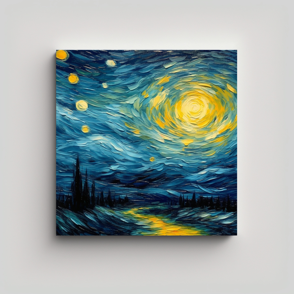 Decora tu hogar con el lienzo de tela colores estilo cielo del norte al estilo de Van Gogh Los tonos de azul marino grisaceo, dorado, negro, turquesa, gris, menta, plateado y chocolate se combinan para crear una obra de arte única El cuadro está impreso en tela de alta calidad con bastidores de madera, garantizando durabilidad y resistencia Compra ahora en DecoCuadros y dale un toque especial a tus espacios