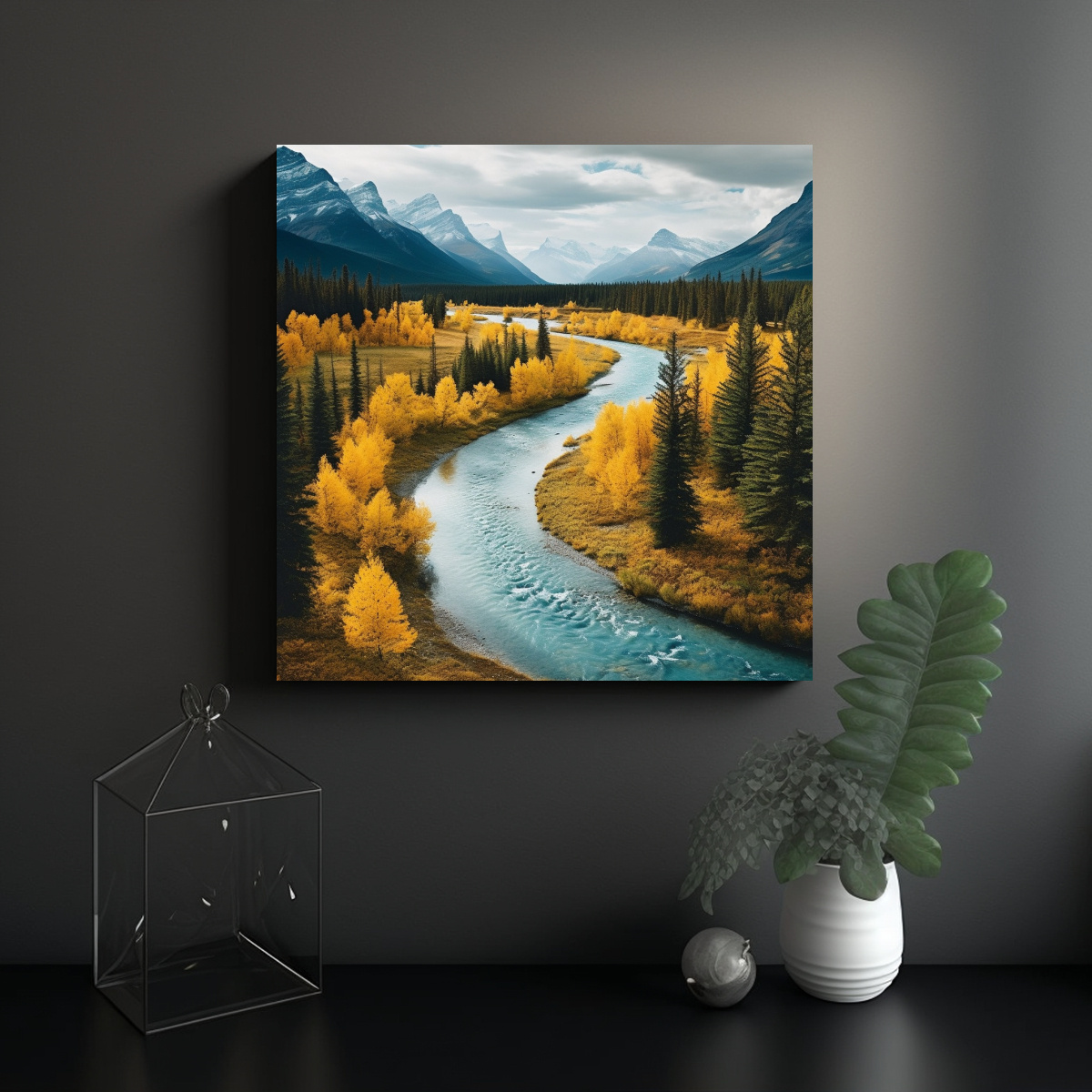 Lienzo De Tela Con Río Y Montañas Azules Y árboles Amarillos.