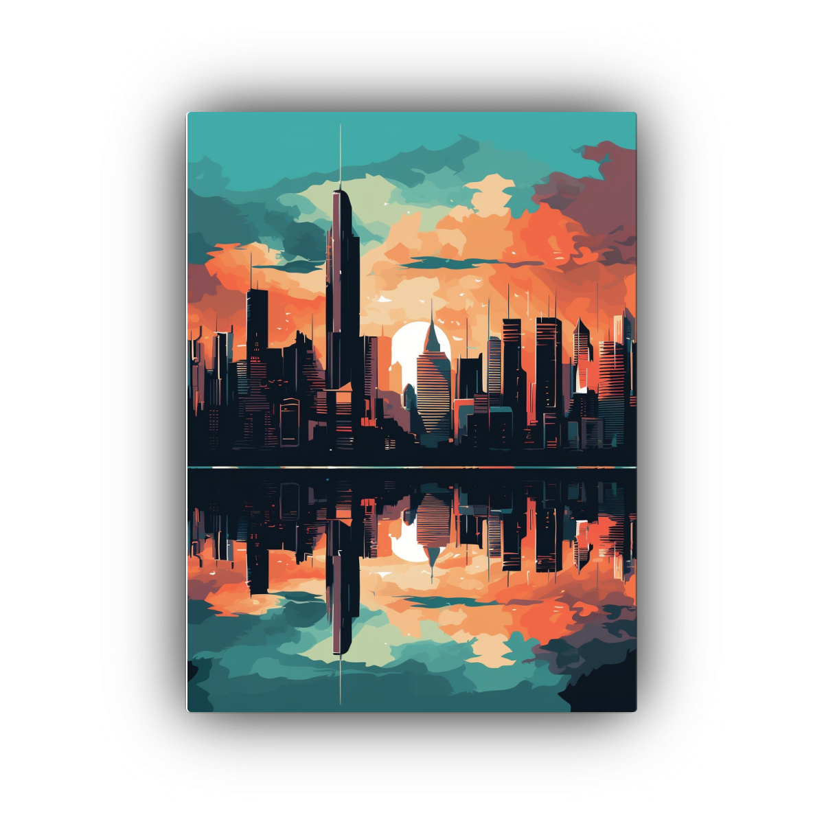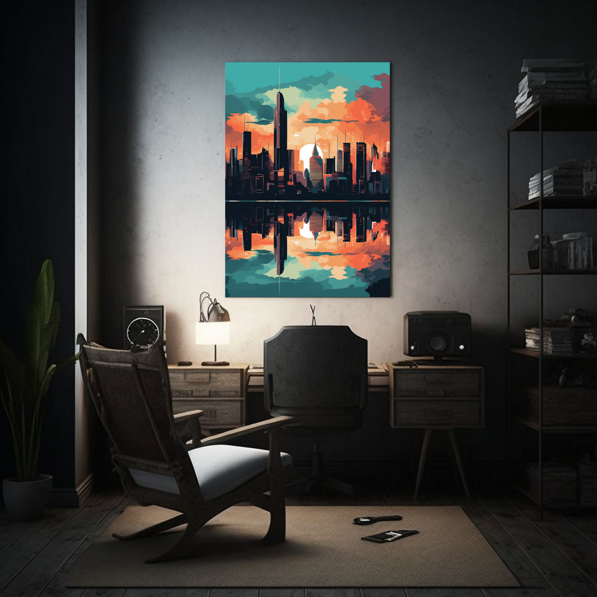 Este cuadro se vería genial colocado en un salón con una decoración minimalista y moderna Combínalo con muebles negros, cojines en tonos turquesa y accesorios en naranja para lograr un ambiente vibrante y sofisticado