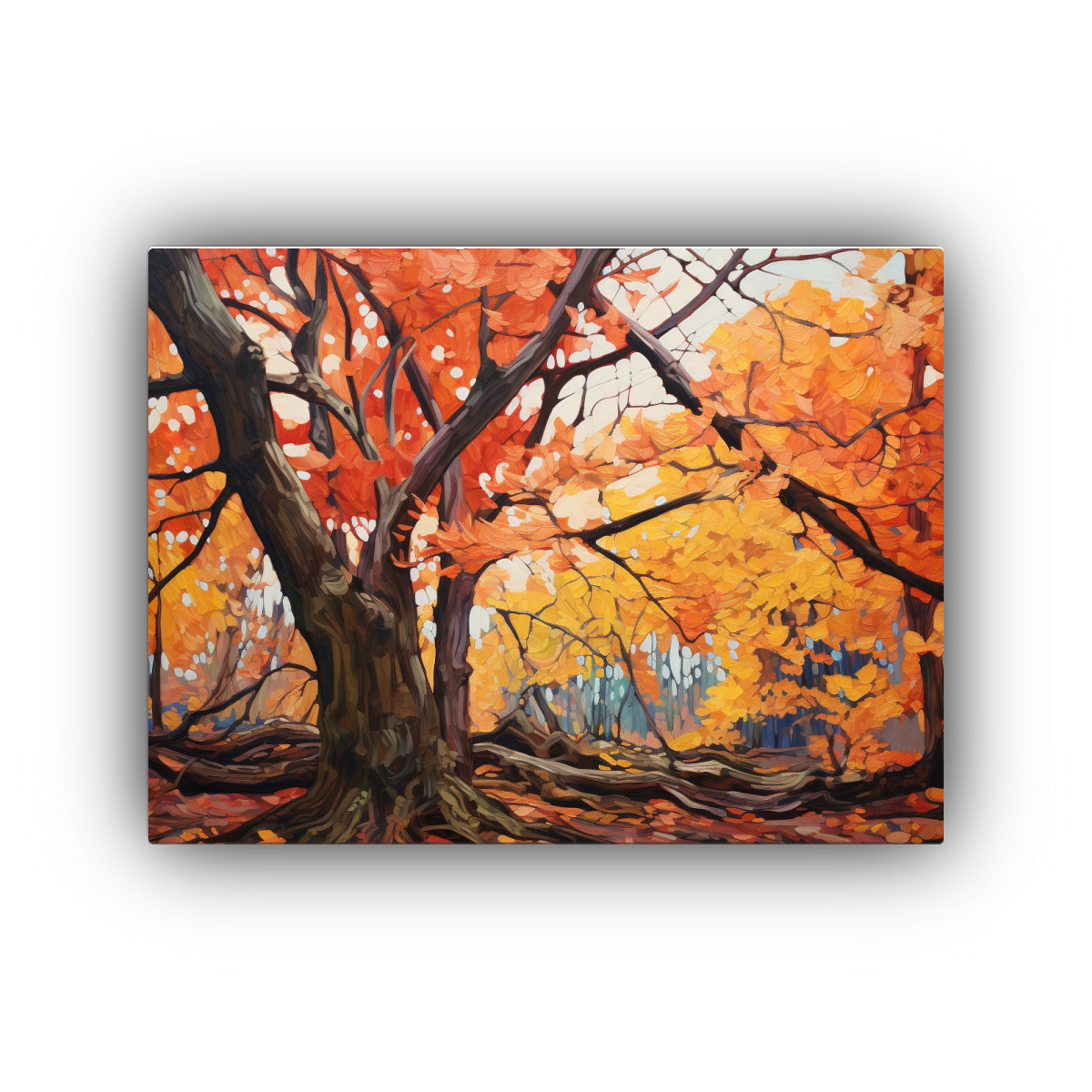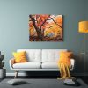 Este cuadro de árboles de arce en tonos intensos y detallados sería ideal para colocar en el área de la sala de estar sobre un sofá gris claro, creando un contraste elegante y moderno Complementa con cojines en tonos lila y coral para una decoración armoniosa