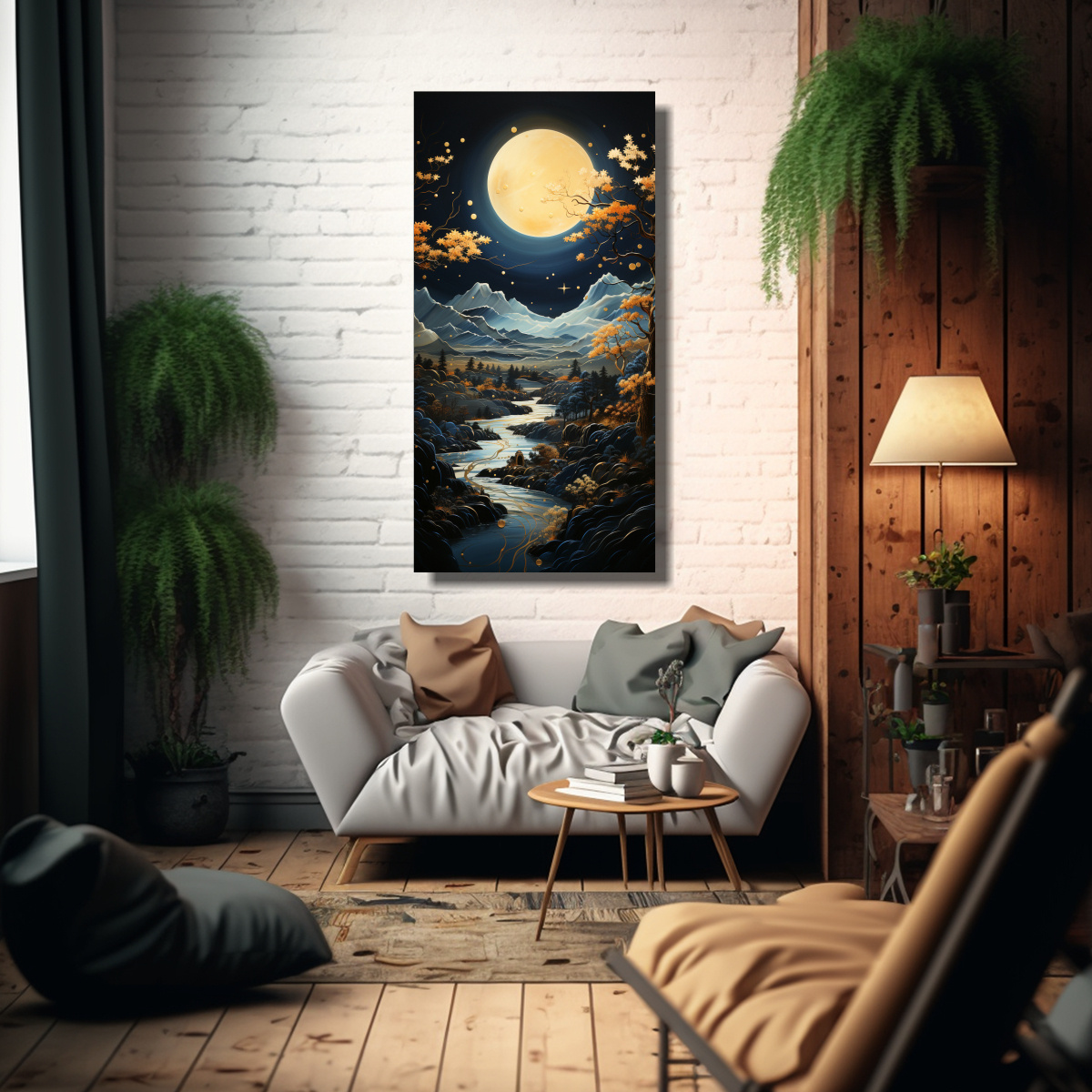 Coloca este cuadro surrealista con luna y montañas en tu sala de estar para crear un ambiente relajante y misterioso Combínalo con muebles en tonos neutros y accesorios en colores plateado, dorado y gris para resaltar su belleza y agregar un toque de sofisticación a tu espacio