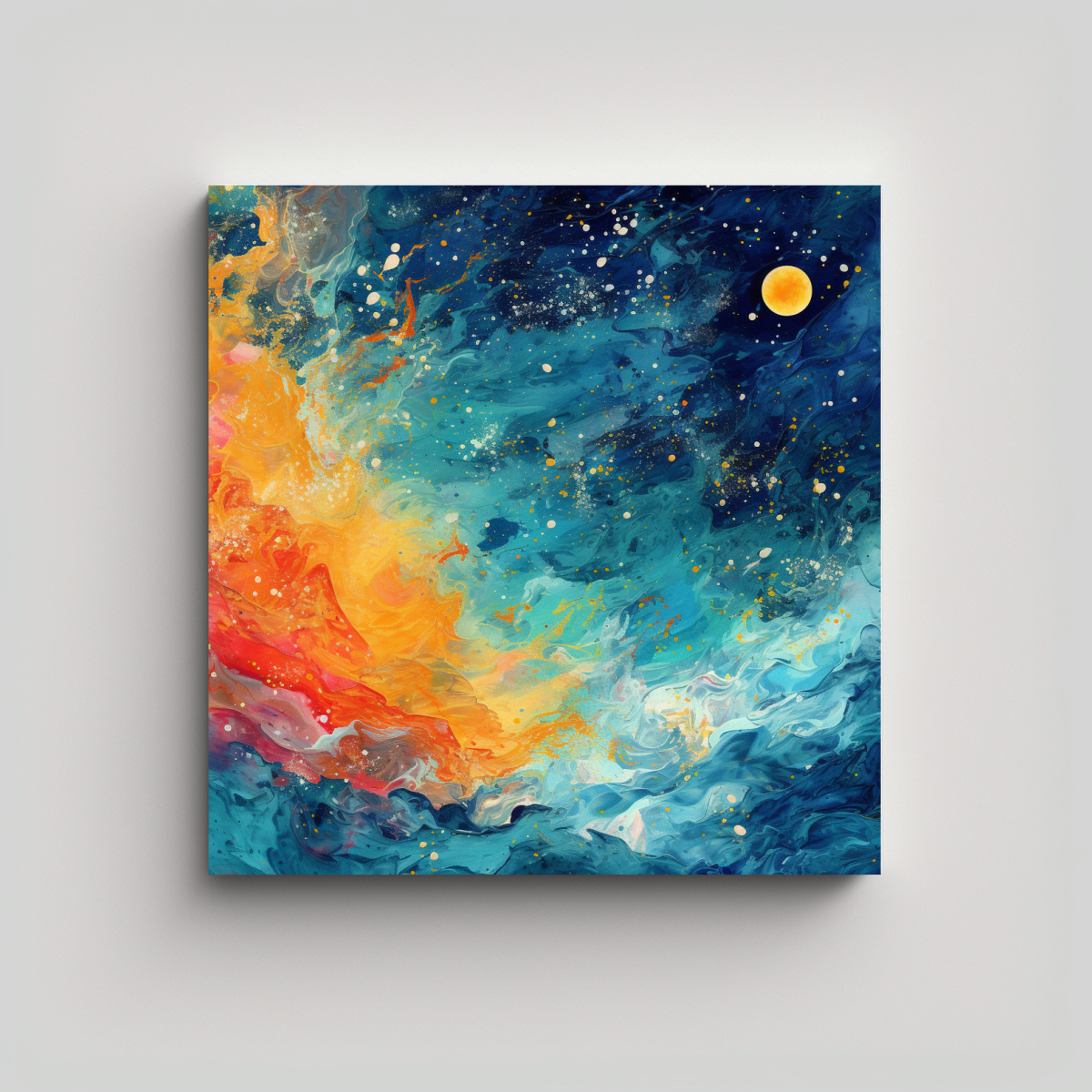 Este hermoso lienzo abstracto en fondo celestial es ideal para decorar tu sala de estar o dormitorio Combínalo con muebles en tonos neutros como blanco, gris o crema, y agrega algunos toques de color con cojines o accesorios en tonos coral o turquesa ¡Crearás un ambiente elegante y sofisticado que seguramente impresionará a tus invitados!