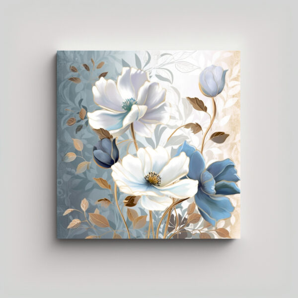 Lienzo Decorativo: Flores Azules, Blancas Y Detalles Bronce
