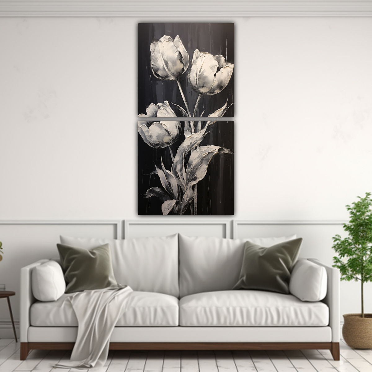Este cuadro Lienzo Dibujo Escena de TULIPANES negros estilo pintura sobre tela encajaría perfectamente en un entorno moderno o minimalista Puedes colocarlo en la sala de estar, el comedor o incluso en una oficina para agregar un toque de sofisticación Combínalo con muebles en tonos neutros como blanco, negro o gris, y complementa la decoración con detalles en dorado para resaltar los colores del cuadro ¡Crea un ambiente elegante y vanguardista con esta pieza única!