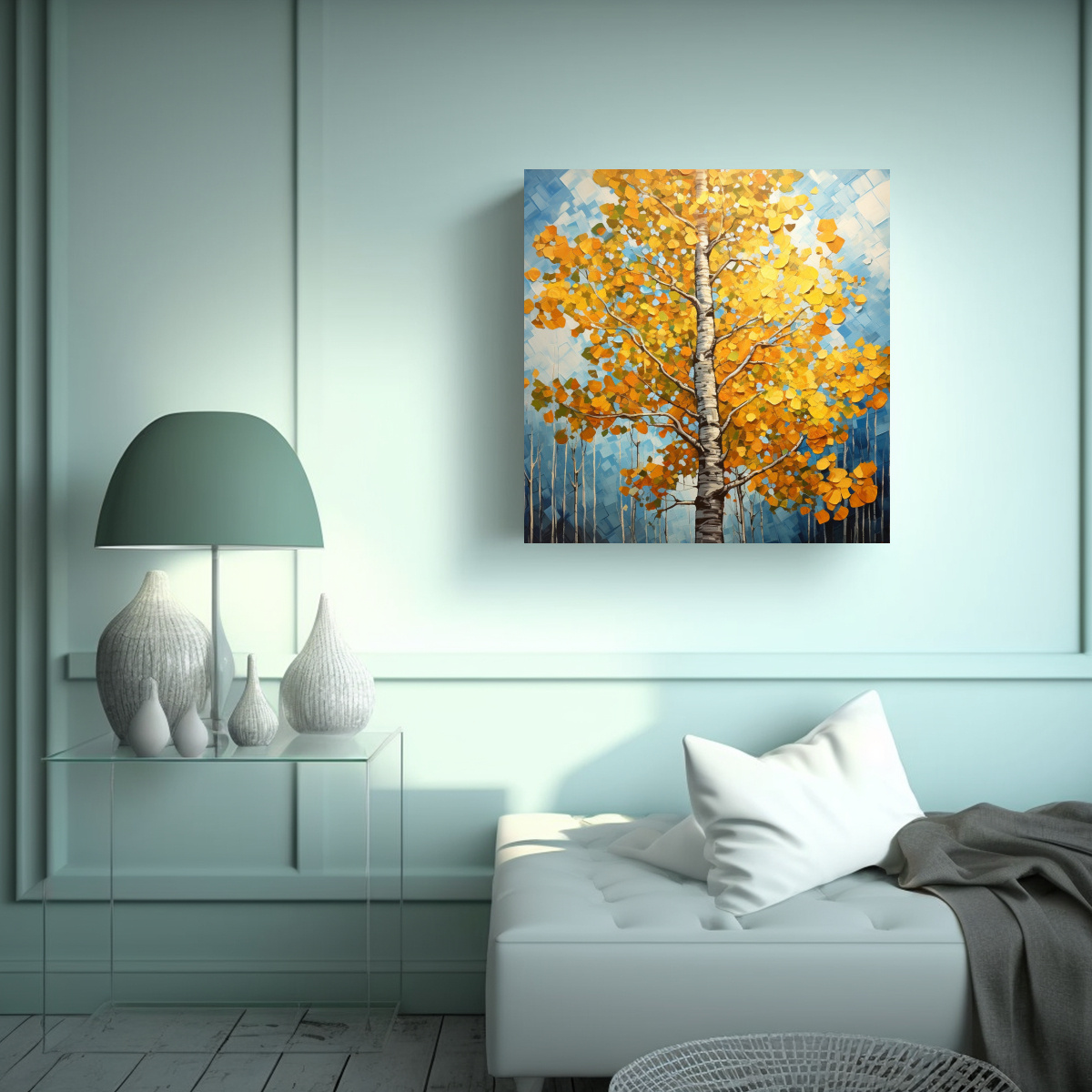 Este cuadro combina perfectamente con una decoración moderna y minimalista Recomendamos colocarlo en el salón principal de tu hogar, sobre un sofá de color gris claro o beige, junto a una mesa de centro de vidrio y una alfombra de tonos neutros Su paleta de colores plateado, gris, mostaza y azul marino grisaceo añadirá un toque de elegancia y sofisticación al ambiente ¡Atrévete a destacar tus espacios con el Lienzo Moderno Escenario de un Árbol de Aspen de DecoCuadros!