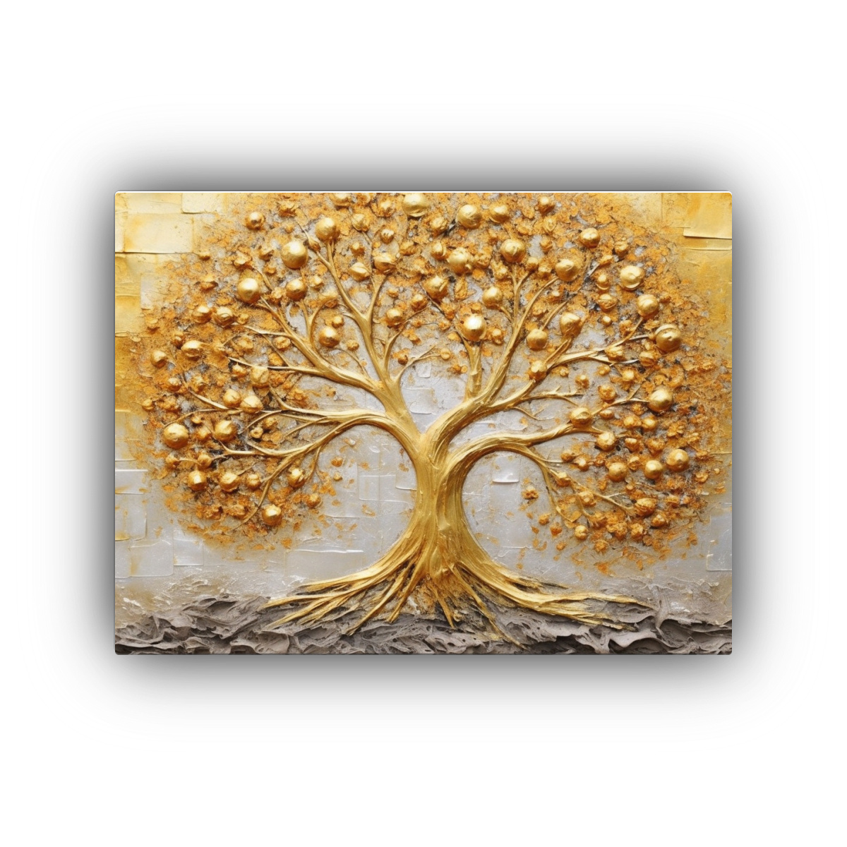 Lienzo Obra Maestra árbol Dorado Vida Con Diamantes Plateados.