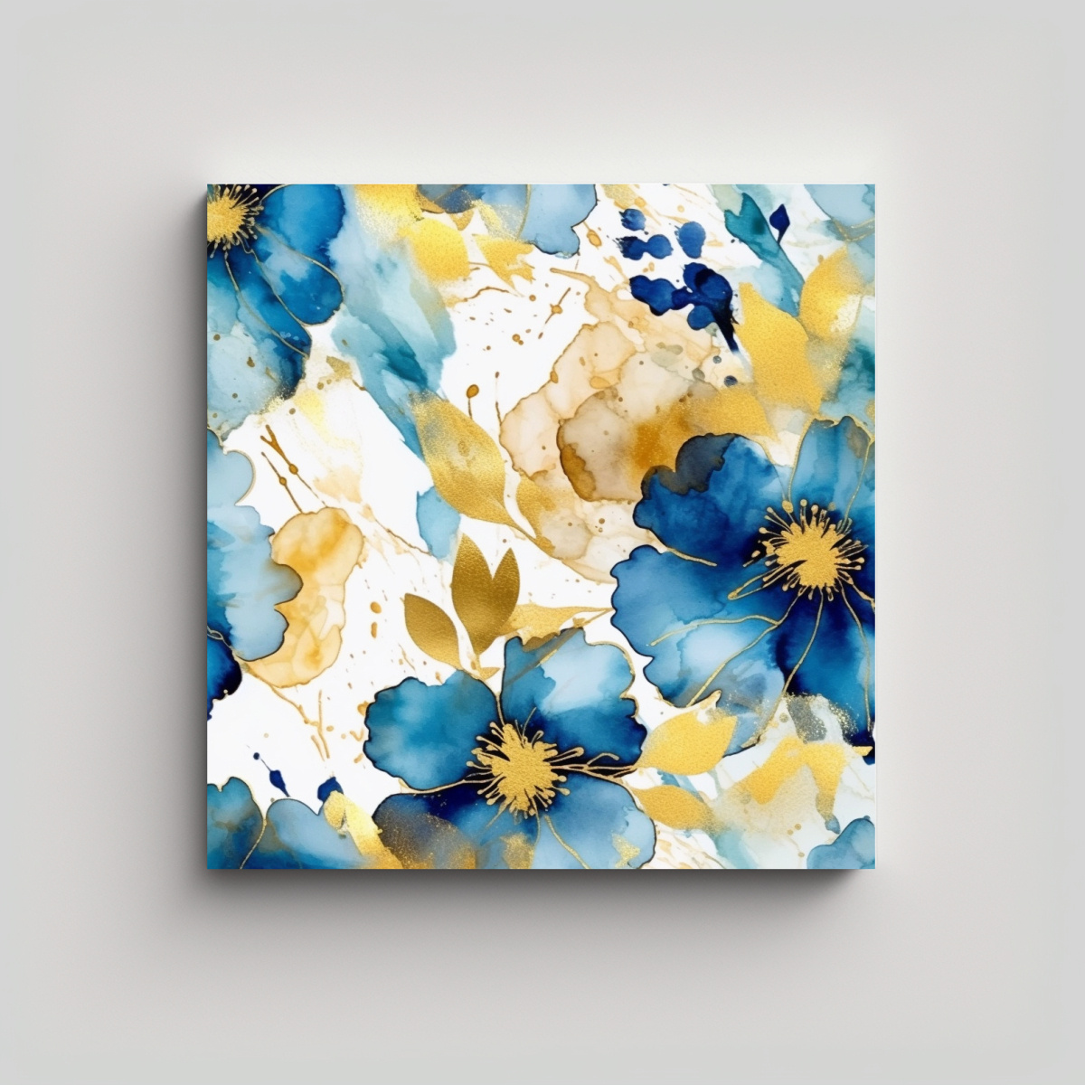 Lienzo Tela Alta Calidad Perspectiva Azul Con Flores Doradas Y Pinturas Decorativas