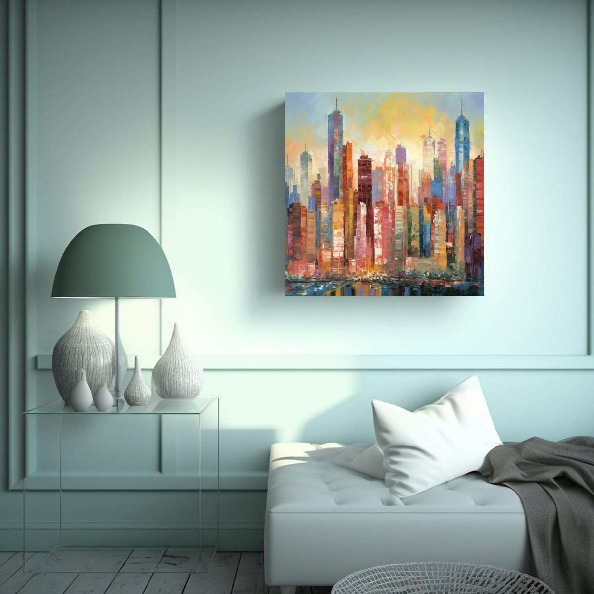 Lienzo Tema Impacto Visual: Una Vibrante Ciudad Se Despliega En El Horizonte Al Atardecer.