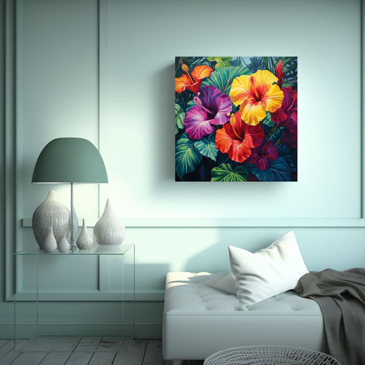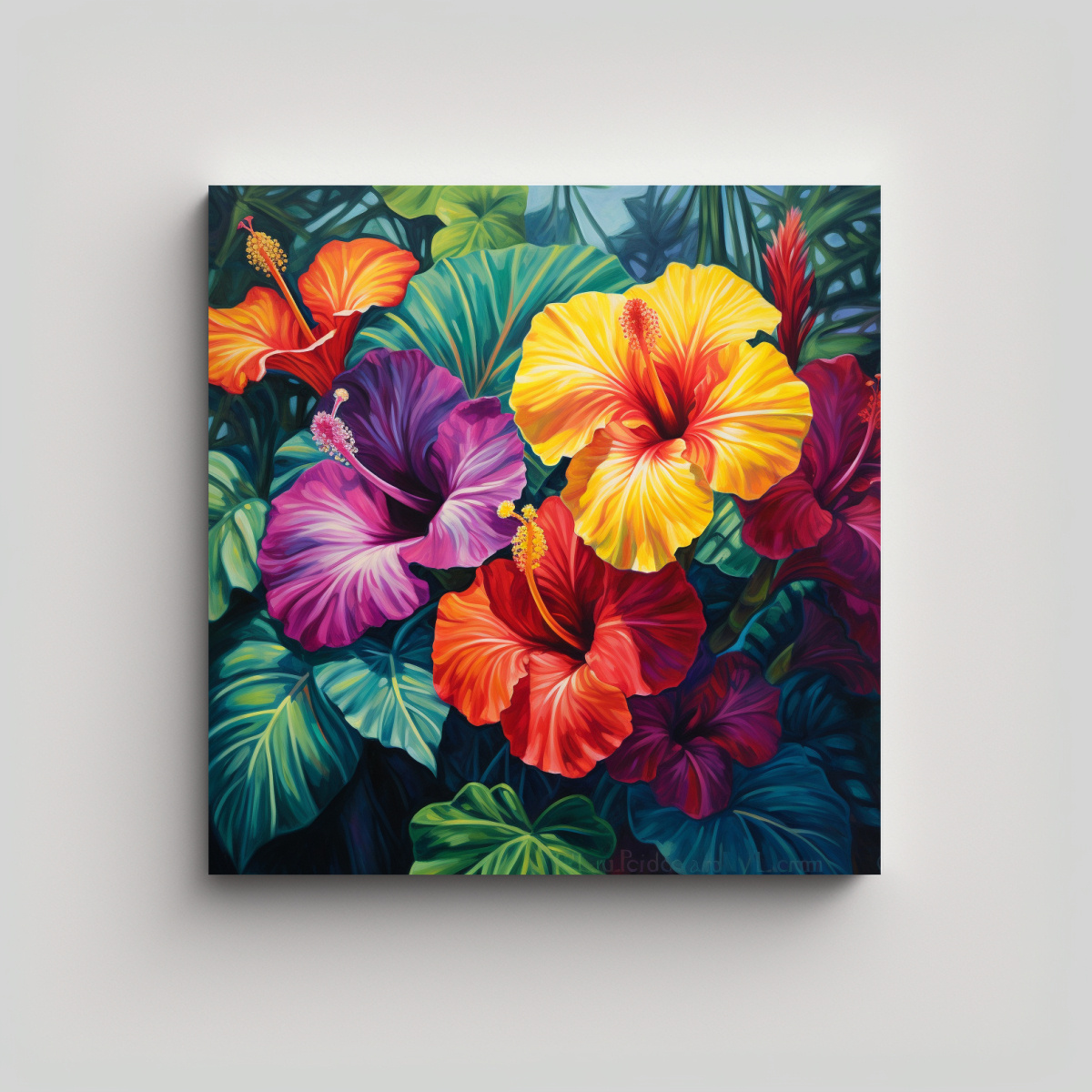 Lienzo Visual Con Flores De Hibisco Y Monstera Coloridas
