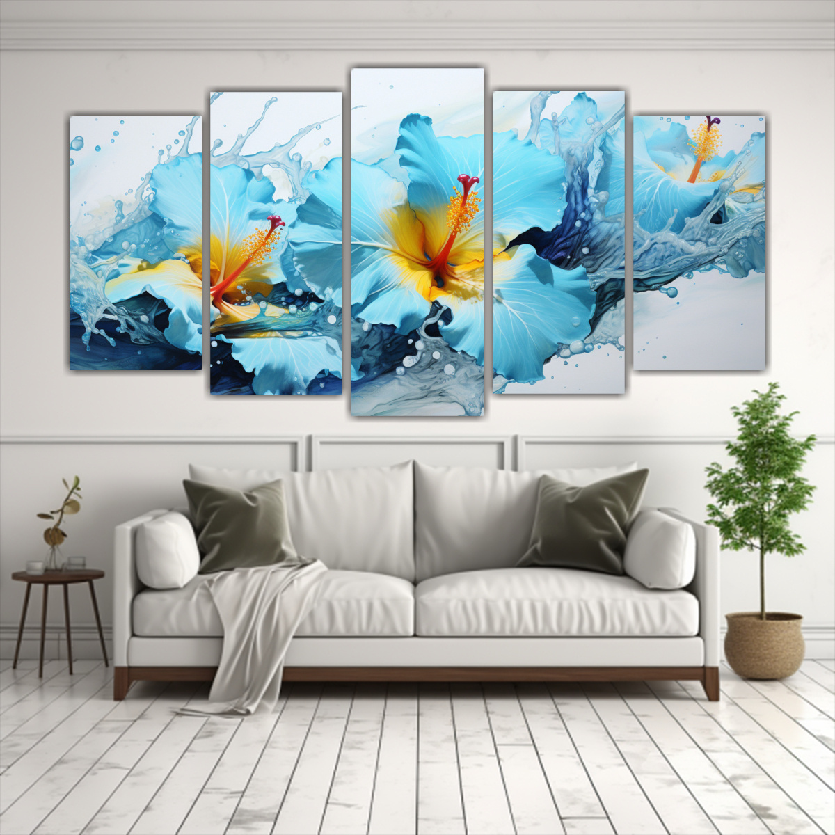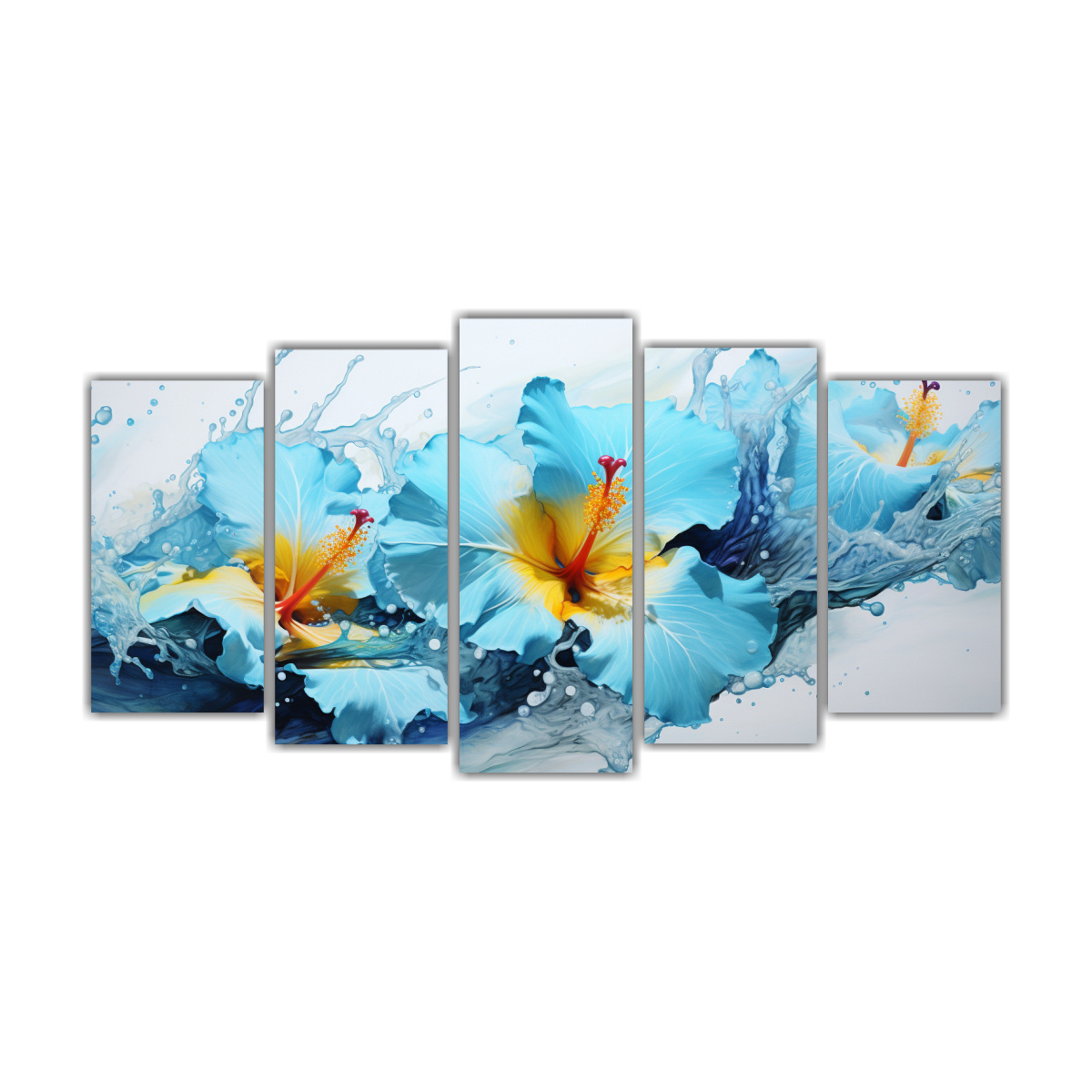 Renueva tu espacio con estos lienzos acuarela hibiscos en colores blanco y turquesa Ideales para salas, dormitorios o espacios de relajación Atrévete a darle un toque moderno y fresco a tu decoración con este conjunto de 5 cuadros