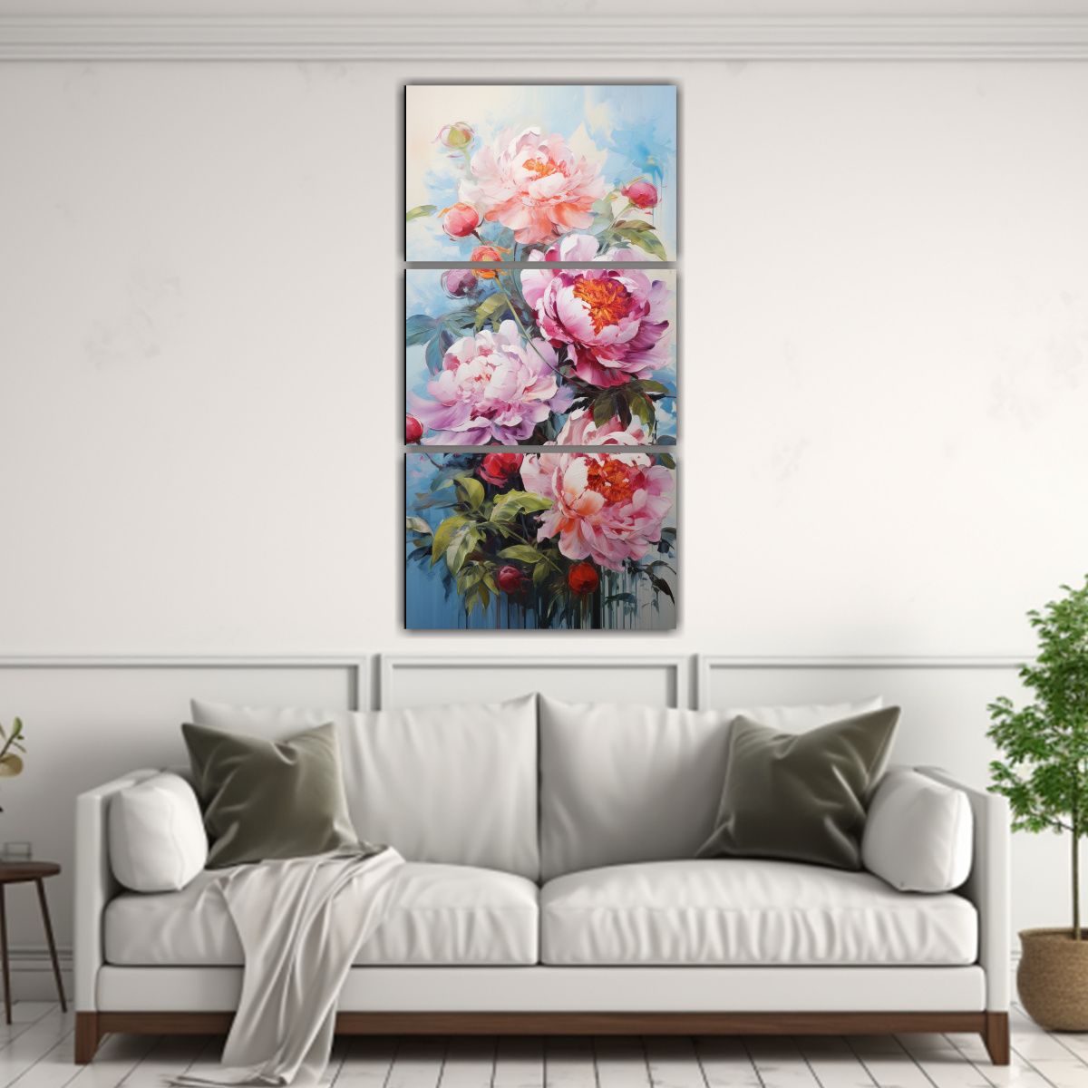 Renueva tu hogar con este hermoso cuadro de PEONIAS vibrantes en acuarela Los tonos Plateado, Azul Marino grisaceo, Carmesí, Gris, Lila, Menta y Turquesa le darán vida a cualquier espacio Coloca este lienzo en tu sala de estar para crear un ambiente colorido y sofisticado