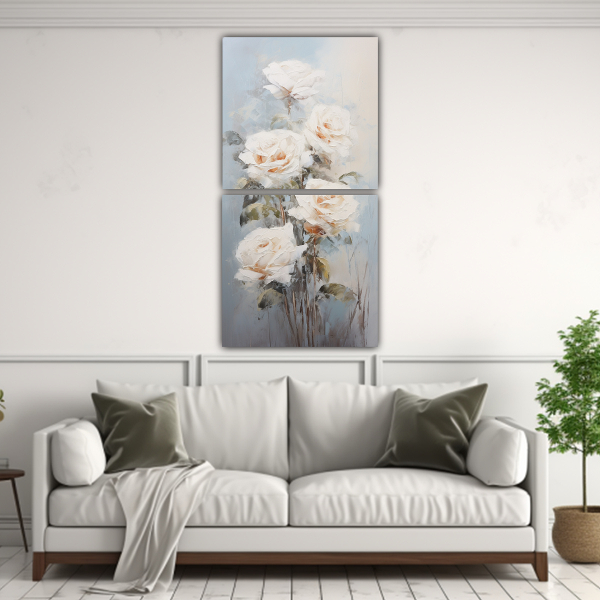 Coloca los Lienzos Concepto Baño a White Roses en la pared principal de tu baño, justo encima de la bañera Su paleta de colores plateados, grises y azules marino grisáceos resaltará la elegancia y tranquilidad del ambiente, creando un espacio armonioso y relajante