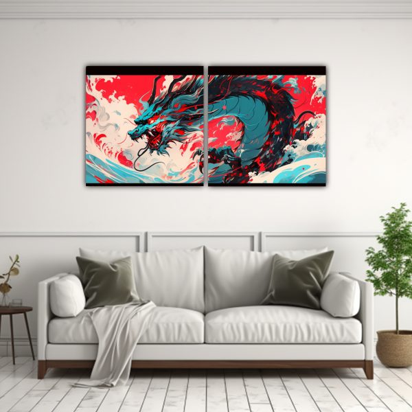 Lienzos De Tela Con Dragón En Rojo Y Turquesa Para Una Decoración única.