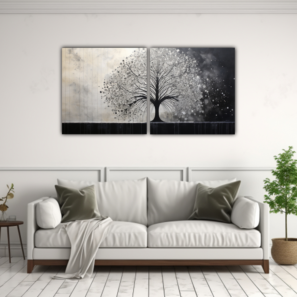 Decora tu sala con los Lienzos de Tela Creativa para Sala Árbol en Negro y Plata de DecoCuadros Diseños exclusivos, alta calidad y precios económicos Entrega rápida y envíos express a regiones
