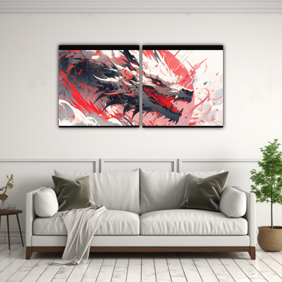 Para resaltar al máximo la magia del dragón en blanco y rojo, coloca estos lienzos en una pared de color blanco o gris claro Acompáñalos con muebles en tonos neutros para lograr un ambiente equilibrado y sofisticado