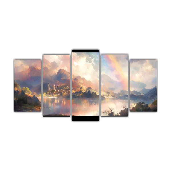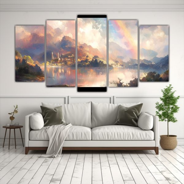 Lienzos De Tela Dibujo Innovador: Montañas Junto Al Lago Con Arcoíris Y Colores Amarillos