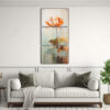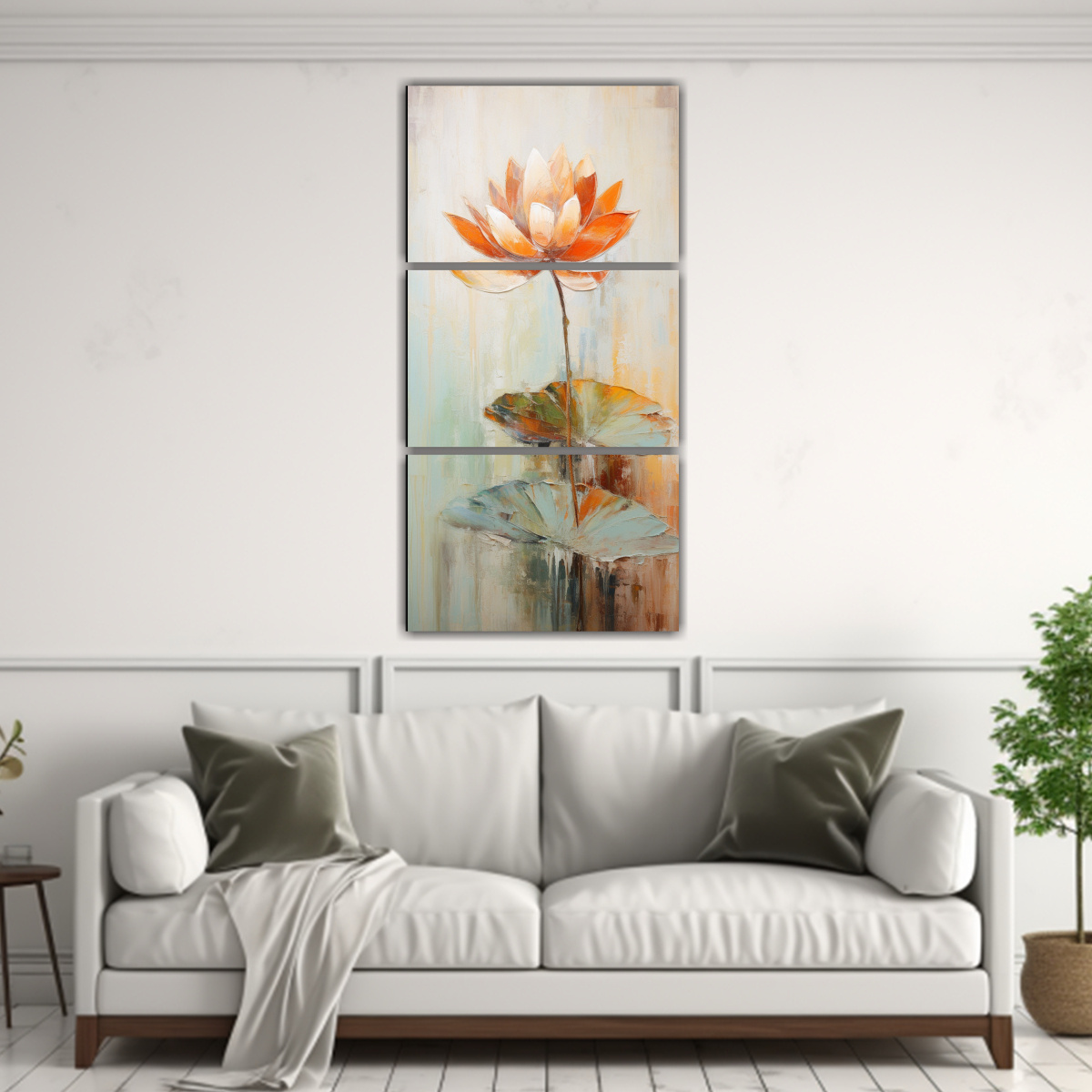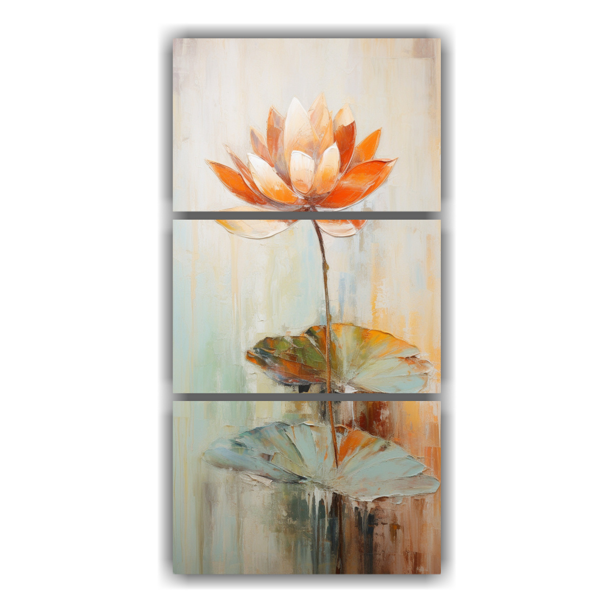 Este cuadro de flores de loto en tonos naranjas es perfecto para decorar un espacio tranquilo y relajante, como un dormitorio o una sala de yoga Combínalo con tonos suaves de blanco y beige para crear una atmósfera serena y equilibrada