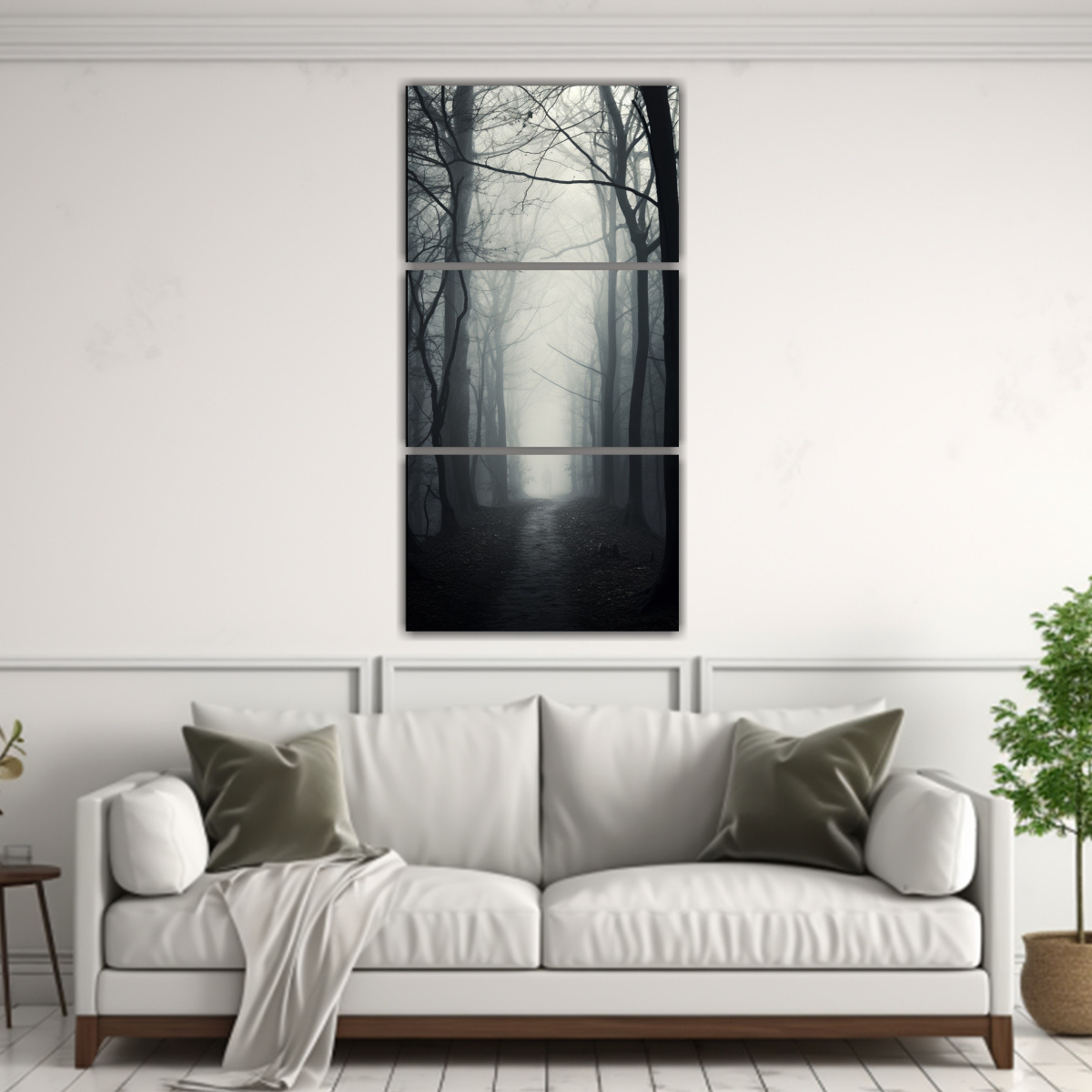 Para lograr un ambiente armonioso, coloca este set de 3 lienzos en tonos bosque brumoso en el área de tu sala de estar junto a muebles de tonos neutros como beige o blanco Asegúrate de que la iluminación sea suave para realzar la serenidad de la imagen