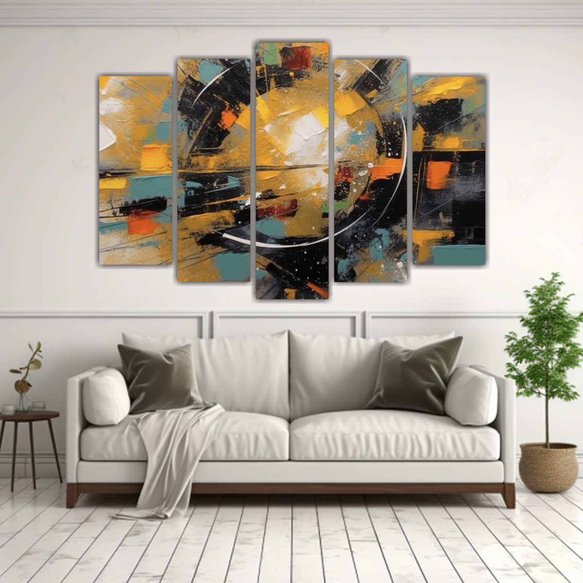 Coloca este conjunto de cinco lienzos en la sala de estar para crear un impactante punto focal Combina los tonos Gris, Negro, Plateado, Azul Marino grisaceo, Coral y Chocolate con muebles de colores neutros para lograr un ambiente moderno y elegante