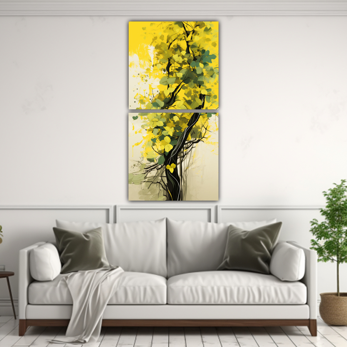 Para crear un ambiente relajante en tu baño, coloca el Lienzo Moderno Bosque de banianos en colores amarillo y verde con atmósfera neonoir sobre una pared de tonos neutros, como beige o gris, para resaltar los colores vibrantes del cuadro Combínalo con accesorios en colores dorados o plateados para darle un toque de elegancia ¡Transforma tu baño en un oasis de paz con este hermoso cuadro de DecoCuadros!