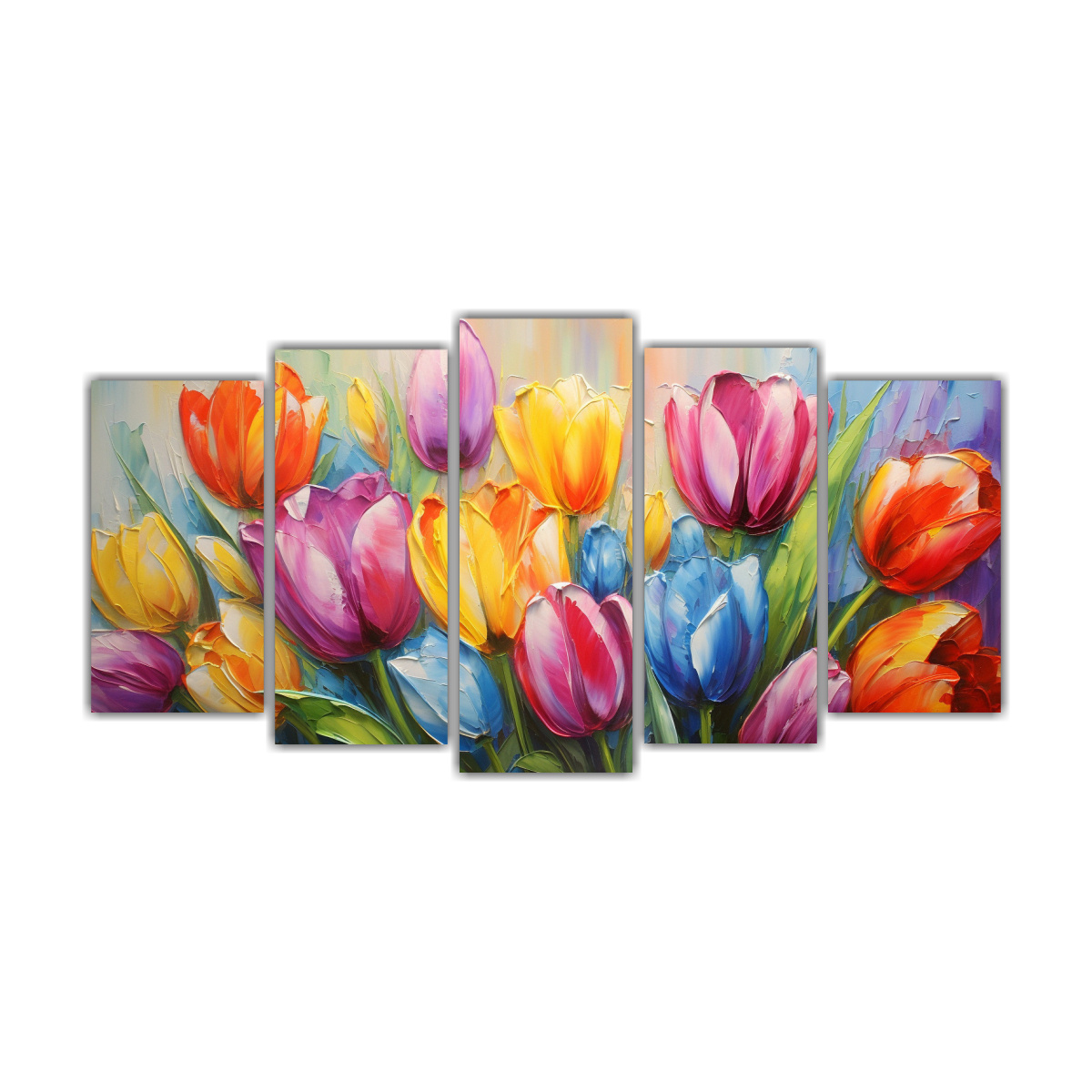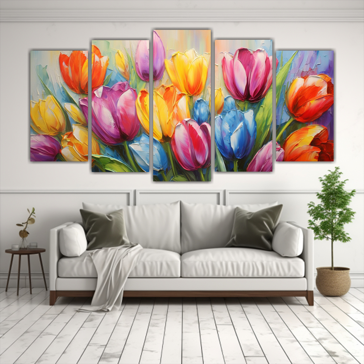 Coloca este cuadro de tulipanes arcoíris en el arte en tu sala de estar para crear un ambiente alegre y vibrante Combínalo con cojines en tonos pastel y cortinas blancas para resaltar los colores de la pintura ¡Impresiona a tus invitados con esta pieza única de arte en tu hogar!