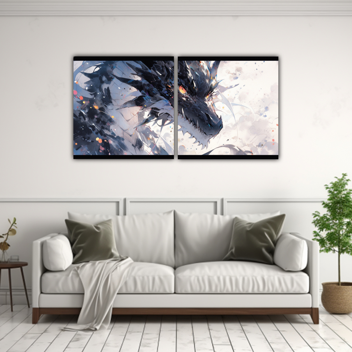 Este cuadro Dragon Acuarela y Blanco Neonoir Atmosfera lucirá espectacular en tu sala de estar sobre un sofá de color neutro, aportando un toque de color y misterio Combínalo con cojines en tonos plateados y verdes para una decoración elegante y moderna