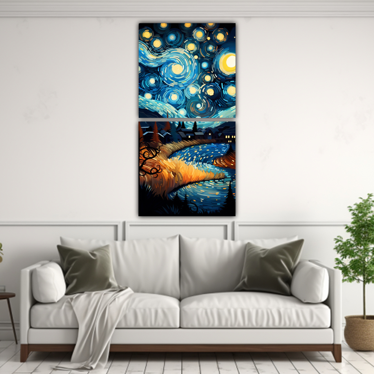 Este cuadro es perfecto para decorar el salón o el dormitorio principal Combina a la perfección con muebles en tonos neutros como el blanco o el beige, y también con elementos decorativos en tonos plateados o turquesas Colócalo sobre un mueble auxiliar o en una pared destacada para darle protagonismo a esta reinterpretación abstracta de Starry Night de Van Gogh