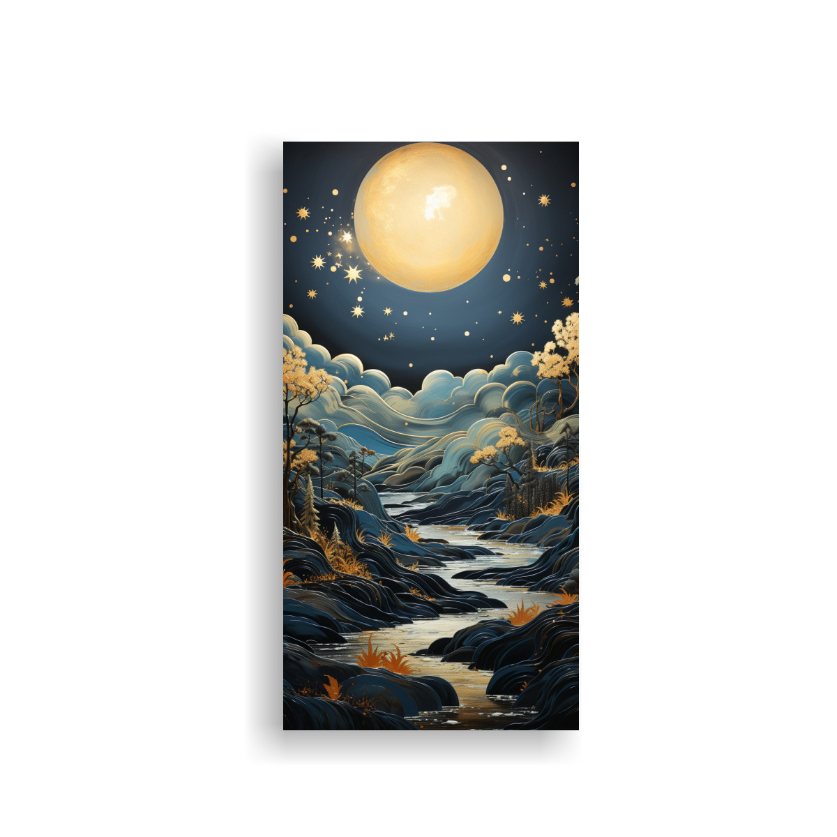 DecoCuadros te ofrece una composición detallada de una luna cerca de las montañas, con colores plateado, azul marino grisaceo, dorado, gris, coral y chocolate Los mejores precios y calidad del mercado