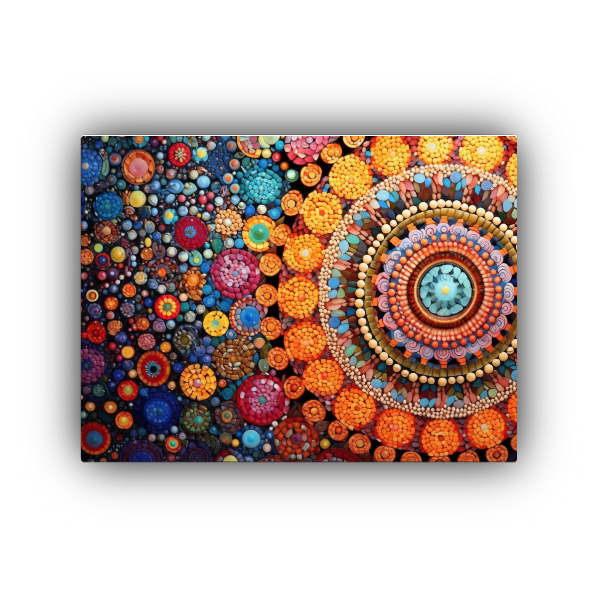 Para lograr un efecto impactante, coloca este cuadro mandala mosaico en un pared de color blanco o beige, permitiendo que los tonos vibrantes resalten Combínalo con cojines en tonos similares y velas para crear un espacio de meditación y relajación en tu hogar