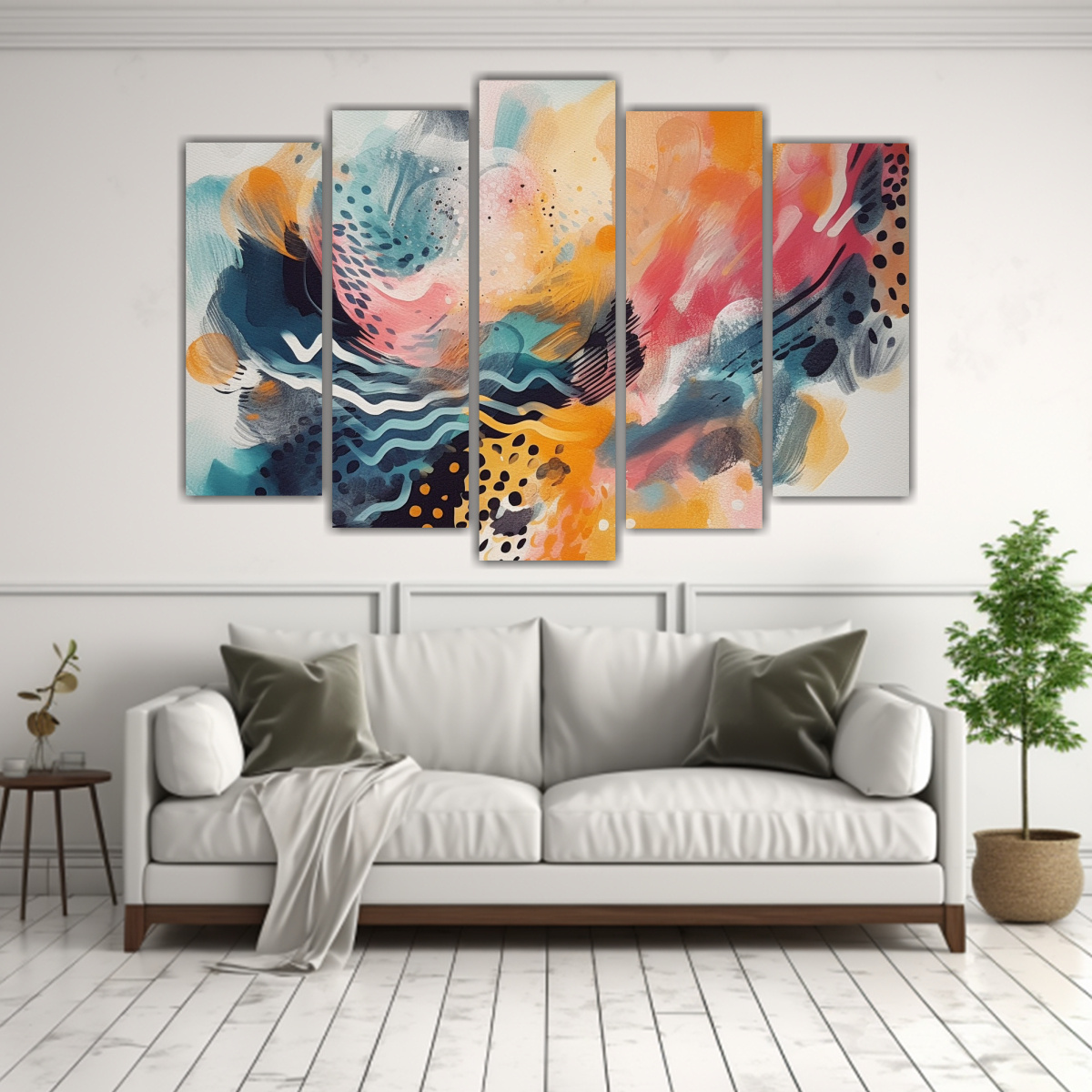 Este Mural abstracto con cinco cuadros de colores es ideal para colocar sobre un sofá en la sala de estar, creando un punto focal elegante Combina los tonos del cuadro con cojines y accesorios en Coral, Beige y Gris para una decoración armoniosa