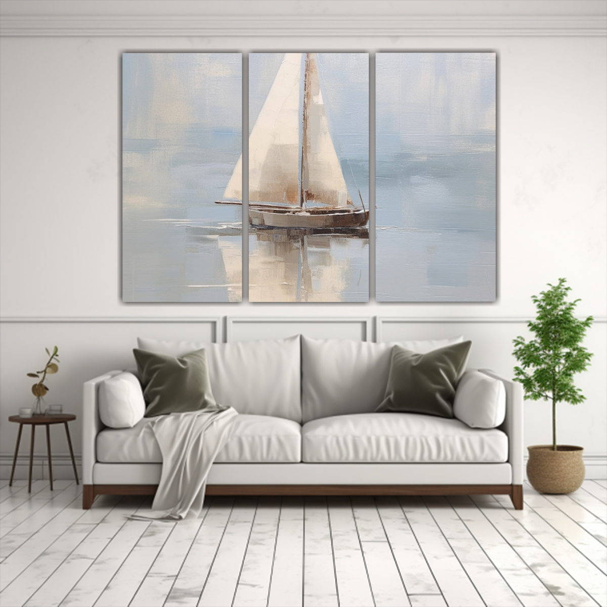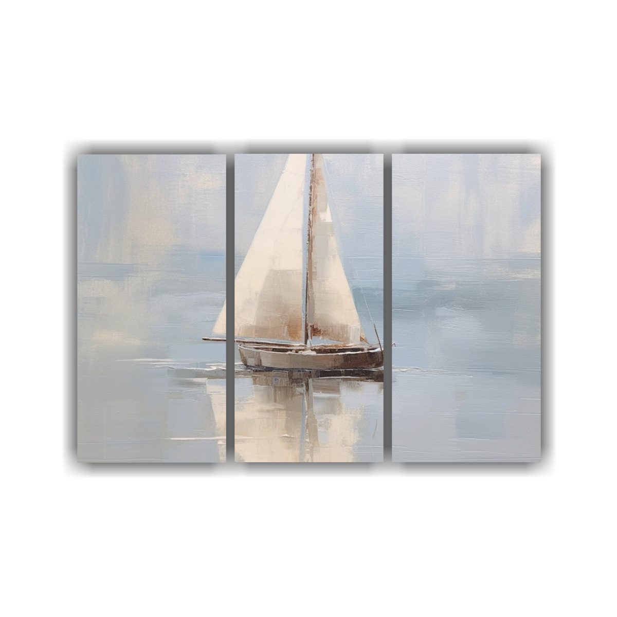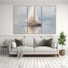 Este cuadro de un velero abstracto en agua se vería espectacular en la sala de estar sobre un sofá gris oscuro Complementa la paleta de colores del cuadro con cojines azul marino y una manta plateada para lograr un ambiente sofisticado y relajante
