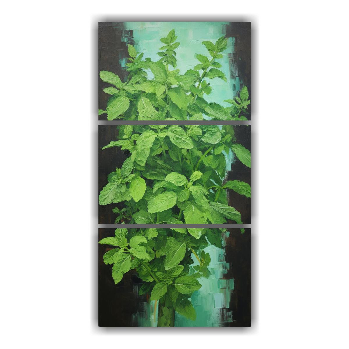 El cuadro abstracto de tres dibujos de hierbas menta en lienzo es perfecto para añadir un toque de frescura y sofisticación a tu hogar u oficina Nuestros diseños exclusivos harán que tu espacio destaque, y con nuestras entregas rápidas y gratuitas en Santiago, podrás disfrutarlo en poco tiempo