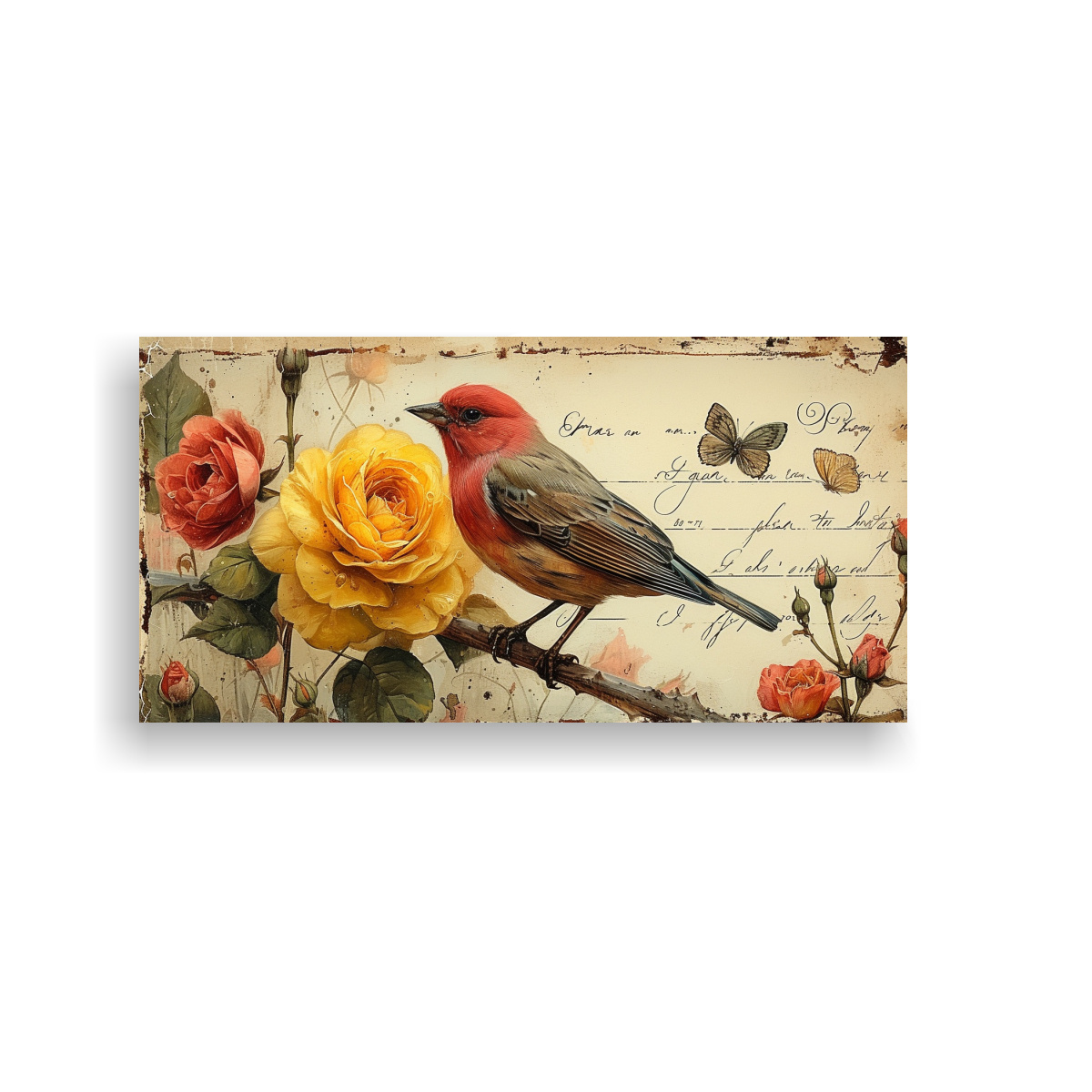 Este cuadro ‘Página de diario con rosas amarillas y decoración en verde’ sería ideal para colocar en la pared principal de tu sala de estar, creando un ambiente cálido y acogedor Combínalo con muebles en tonos neutros para resaltar su belleza única