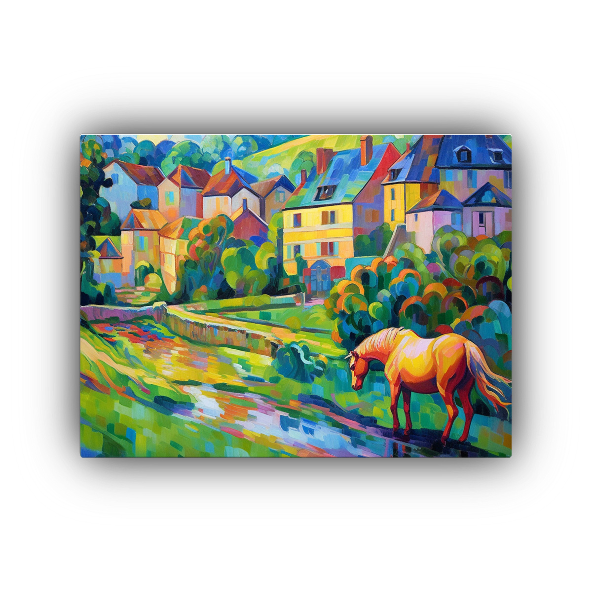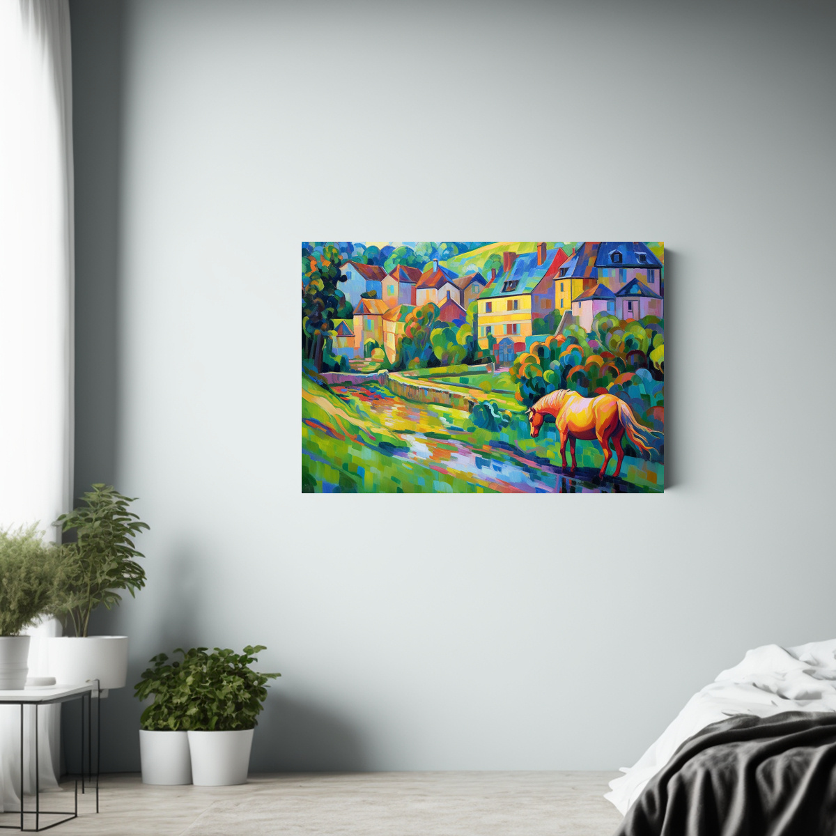 Paisaje De Casas Y Caballos: Lienzo Decorativo Horizontal Estilo.